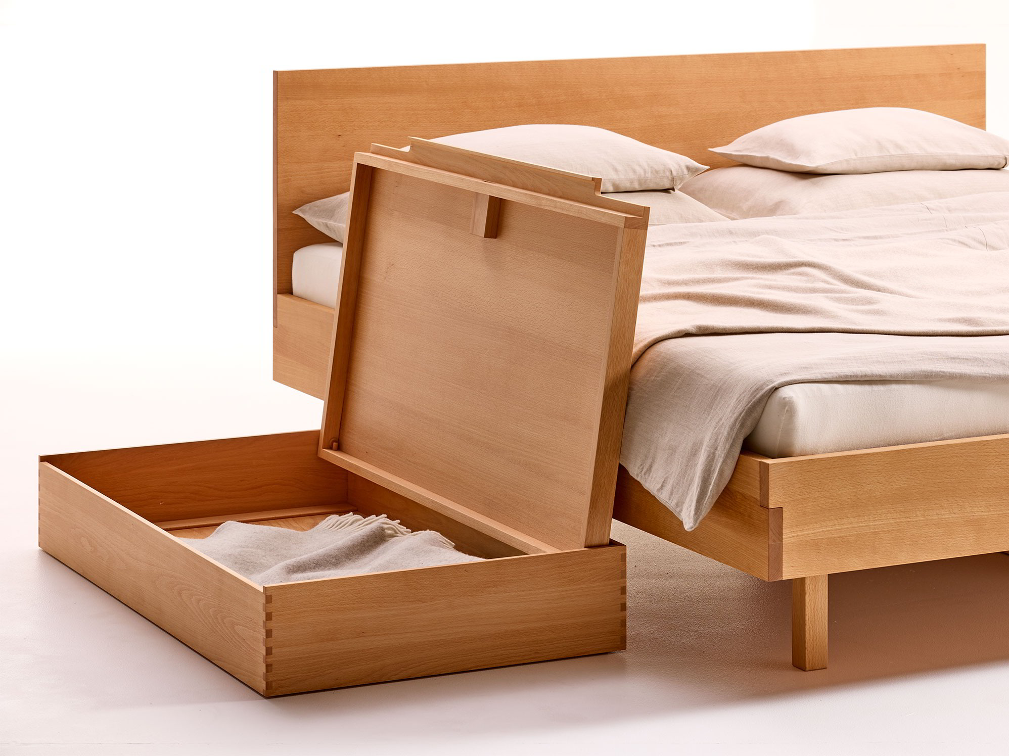 Die nach innen versetzten Füße lassen das Bett trotz seiner sehr präsenten Holzflächen optisch leicht und schwebend erscheinen.