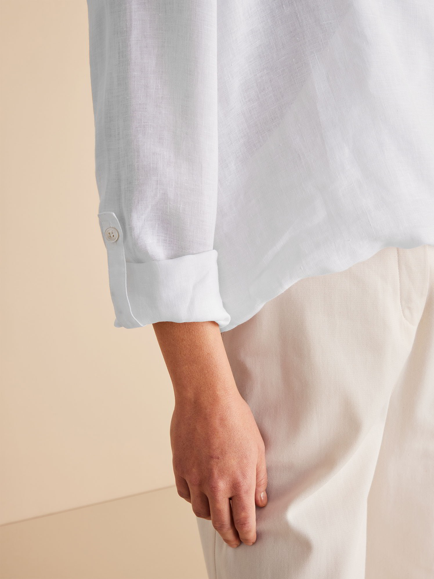 Zeitlos, feminin und elegant: Diese Bluse entsteht aus edlem Leinen, welches bei unserem Partnerbetrieb in Österreich sorgfältig gewebt und in der Tschechischen Republik mit kleinen, liebevollen Details versehen wird. Das Kleidungsstück in Wickeloptik kann als Solist oder in Kombination mit einem Top getragen werden. Die Bluse mit der Rückenpasse hat eine kurze Länge und ist sehr locker geschnitten.Details: Die Ärmellänge lässt sich über eine Ärmellasche mit Knopf variieren.Schnitt: leger. In Größe 36 ca. 58 cm lang.Unsere Models sind zwischen 175 cm und 177 cm groß und tragen Kleidergröße 36.Verarbeitung: 100 % Leinen. Leinen aus Frankreich.Gewebt in Österreich.Fair gefertigt in der Tschechischen Republik. -