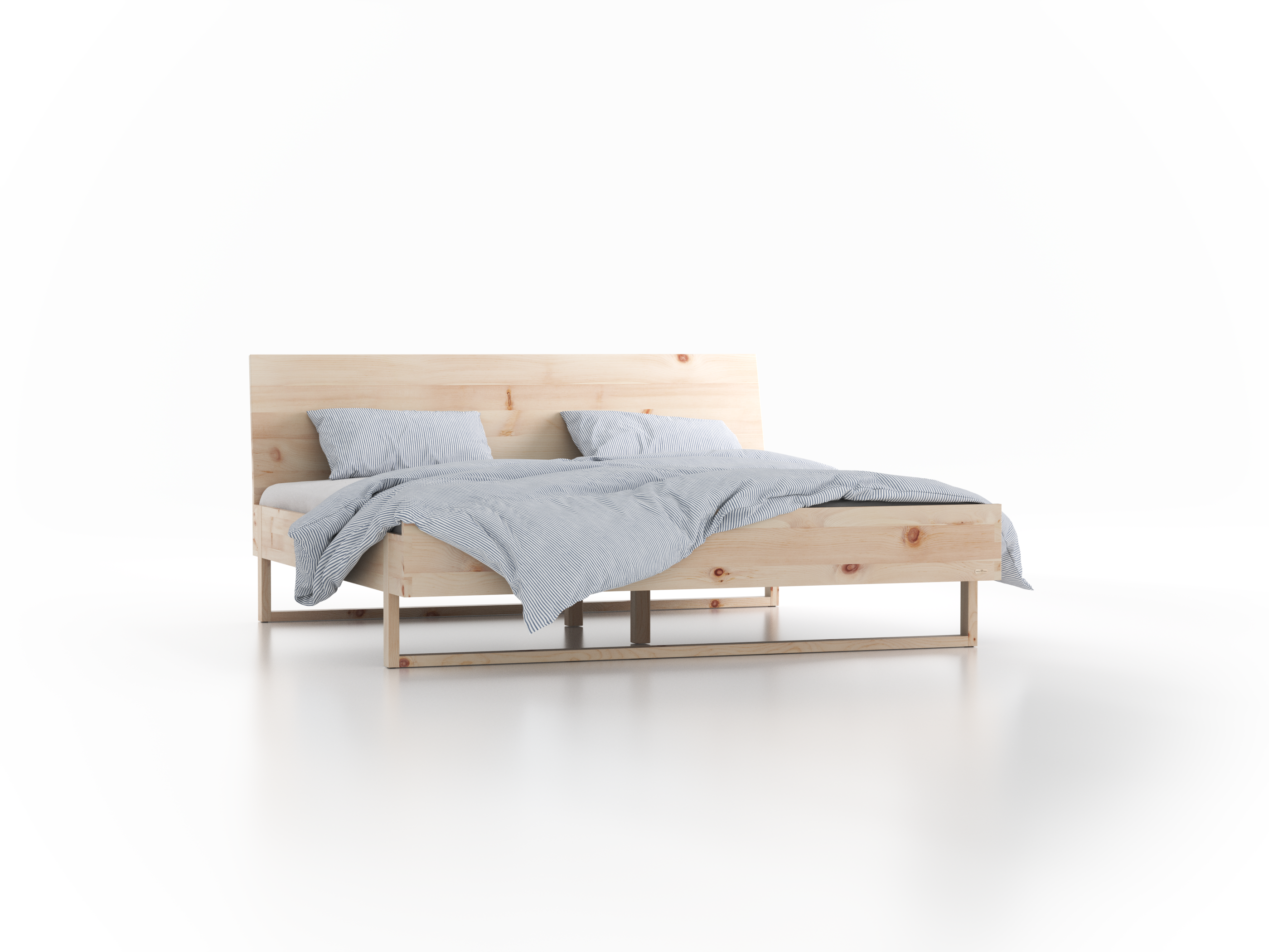 Vor allem in Zirbe ausgeführt, verlangt Akato aufgrund der lebendigen Maserung dieser Holzart nach einfachen, klaren Formen. Die beiden kufenartigen Fußgestelle sind etwas nach innen versetzt und geben dem Bett eine optisch leichte, beinahe schwebende Anmutung. Seitlich hochgezogen, wandeln sich diese Kufen zu sichtbaren Gestaltungselementen, die den robusten Bettrahmen optisch gliedern.