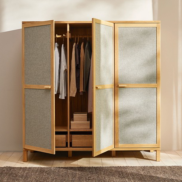 Wir fertigen den Schrank in unserer Kärntner Tischlerei in klassischer Rahmen-und- Füllung-Bauweise: Rahmen aus Massivholz, Füllungen aus Holz oder Stoff. Kurami ist in 3 Varianten wählbar.