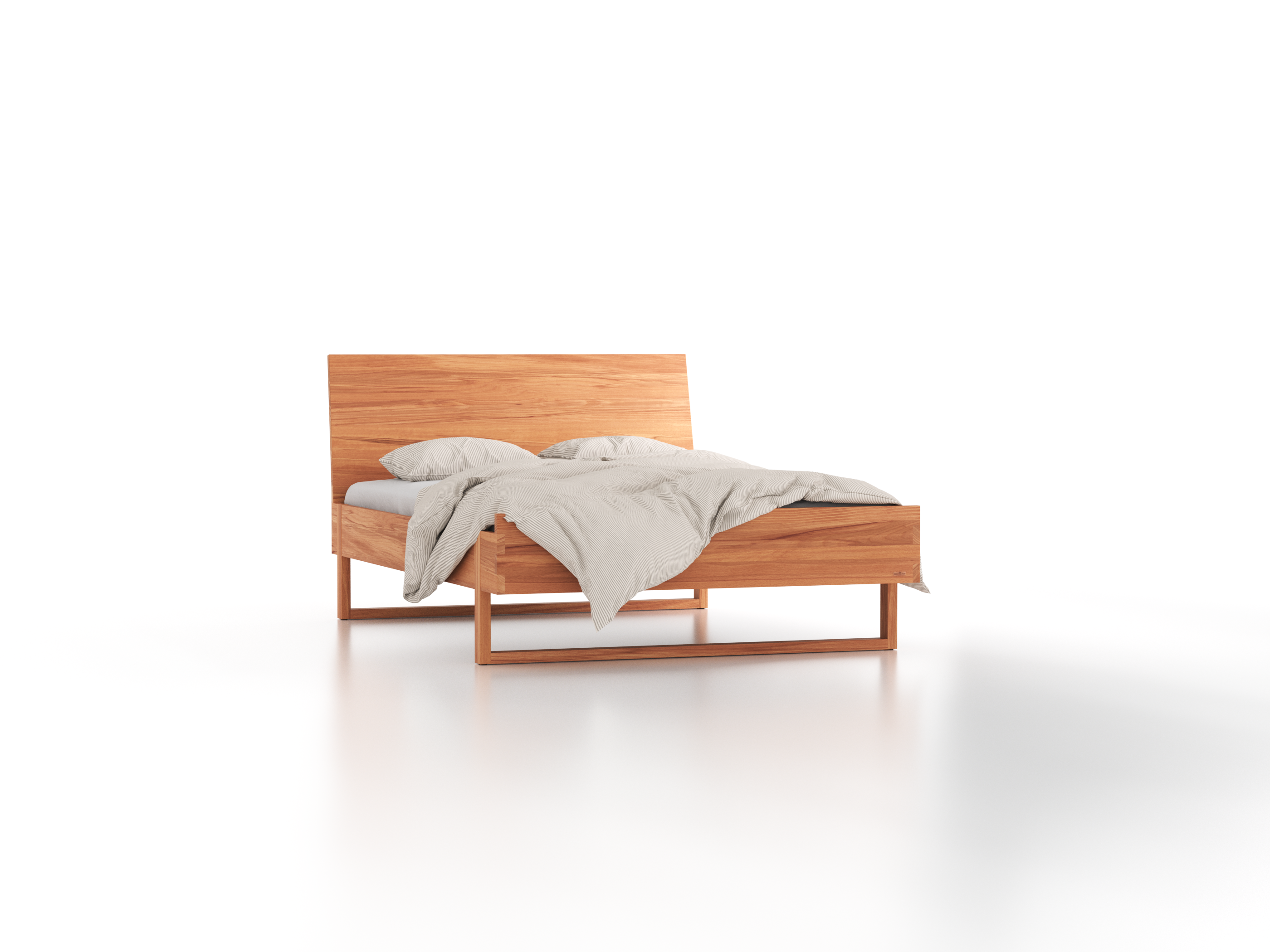 Vor allem in Zirbe ausgeführt, verlangt Akato aufgrund der lebendigen Maserung dieser Holzart nach einfachen, klaren Formen. Die beiden kufenartigen Fußgestelle sind etwas nach innen versetzt und geben dem Bett eine optisch leichte, beinahe schwebende Anmutung. Seitlich hochgezogen, wandeln sich diese Kufen zu sichtbaren Gestaltungselementen, die den robusten Bettrahmen optisch gliedern.