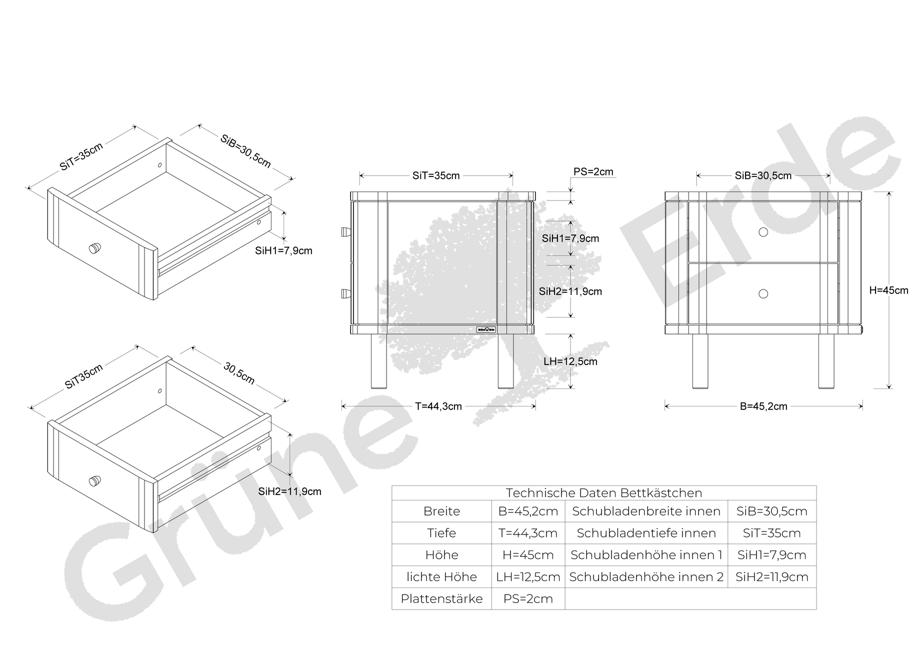 Ein schönes Stück TischlerarbeitDieses Bettkästchen passt vorzugsweise zum Bett Tonda, mit dem es wesentliche Stilelemente gemeinsam hat: schlanke, etwas nach innen versetzte, zylindrische Füße, harmonische Formen, sanft verrundete Ecken und Kanten.Leicht & stabil zugleichDer Korpus ist in traditioneller Rahmen-und-Füllung-Bauweise gefertigt: Rahmen aus Massivholz werden mit Füllungen aus verwindungsfreiem Schichtholz kombiniert. Diese Konstruktion ist relativ leicht und stabil zugleich.Die Füße heben das gedrungene Bettkästchen etwas vom Boden ab, machen es optisch leicht. Sie haben ein aus reißfestem Ahornholz (!) gedrechseltes Gewinde, werden an der Schrankunterseite in ein ebenfalls hölzernes Gegengewinde gedreht, und sind höhenverstellbar – zum Ausgleich kleiner Bodenunebenheiten. So etwas nennt man "Liebe zum Detail".Die mit feinsinnigen Griffen versehenen, geräumigen Schubladen laufen nicht auf Metallauszügen, sondern auf Holzleisten, und werden von Holzdübeln vor zu weitem Ausziehen bzw. Herausfallen bewahrt.Für das Bettkästchen verarbeiten wir hochqualitatives Holz aus mitteleuropäischen, nachhaltig bewirtschafteten Wäldern. Metallfreie, wieder lösbare Holzverbindungen: "Spannschlosszapfen". Die Holzoberfläche ist von Hand mit natürlichem, lösemittelfreiem Pflegeöl eingelassen (Zirbe bleibt unbehandelt). -