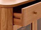 Wohnschrank mit Türen aus Holz oder GlasDieser Wohnschrank gehört zu einer Kollektion von Möbeln, die jeweils für sich stehen können, dennoch signifikante Gemeinsamkeiten haben: den weichen Schwung der Ecken und Kanten sowie jene eleganten, organischen Formen, die an das italienische „Bel Design“ der 1950er-Jahre erinnern.Auf den 2 verstellbaren Fachbrettern, in der 69 cm breiten Lade und auf der 80 x 42 cm großen Deckplatte bietet der Schrank viel Stauraum bzw. reichlich Platz zum Abstellen und Dekorieren.Optische Leichtigkeit & solider KorpusDer Korpus ist in traditioneller Rahmen-und-Füllung-Bauweise gefertigt: Rahmen aus Massivholz werden mit Füllungen aus verwindungsfreiem Schichtholz kombiniert. Diese Konstruktion ist relativ leicht und stabil zugleich.Die Rahmenfüllung der Türen ist wählbar: Schichtholz (6 mm) oder Glas (4 mm, gehärtet, Kanten gesäumt).Die mit feinsinnigen Griffen ausgestatteten Türen sind auf Holzachsen schwenkbar.Die schlanken, nach innen versetzten, zylindrischen Schrankfüße heben Tonda vom Boden ab, machen ihn optisch leicht. Die Füße haben ein aus reißfestem Ahornholz (!) gedrechseltes Gewinde, werden an der Schrankunterseite in ein ebenfalls hölzernes Gegengewinde gedreht, und sind höhenverstellbar – zum Ausgleich kleiner Bodenunebenheiten. So etwas nennt man "Liebe zum Detail".Die mit feinsinnigen Griffen versehene Schublade läuft nicht auf Metallauszügen, sondern auf Holzleisten, und wird von Holzdübeln vor zu weitem Ausziehen bzw. Herausfallen bewahrt.Für den Schrank verarbeiten wir hochqualitatives Holz aus mitteleuropäischen, nachhaltig bewirtschafteten Wäldern. Metallfreie, wieder lösbare Holzverbindungen: "Spannschlosszapfen". Die Holzoberfläche ist von Hand mit natürlichem, lösemittelfreiem Pflegeöl eingelassen. -