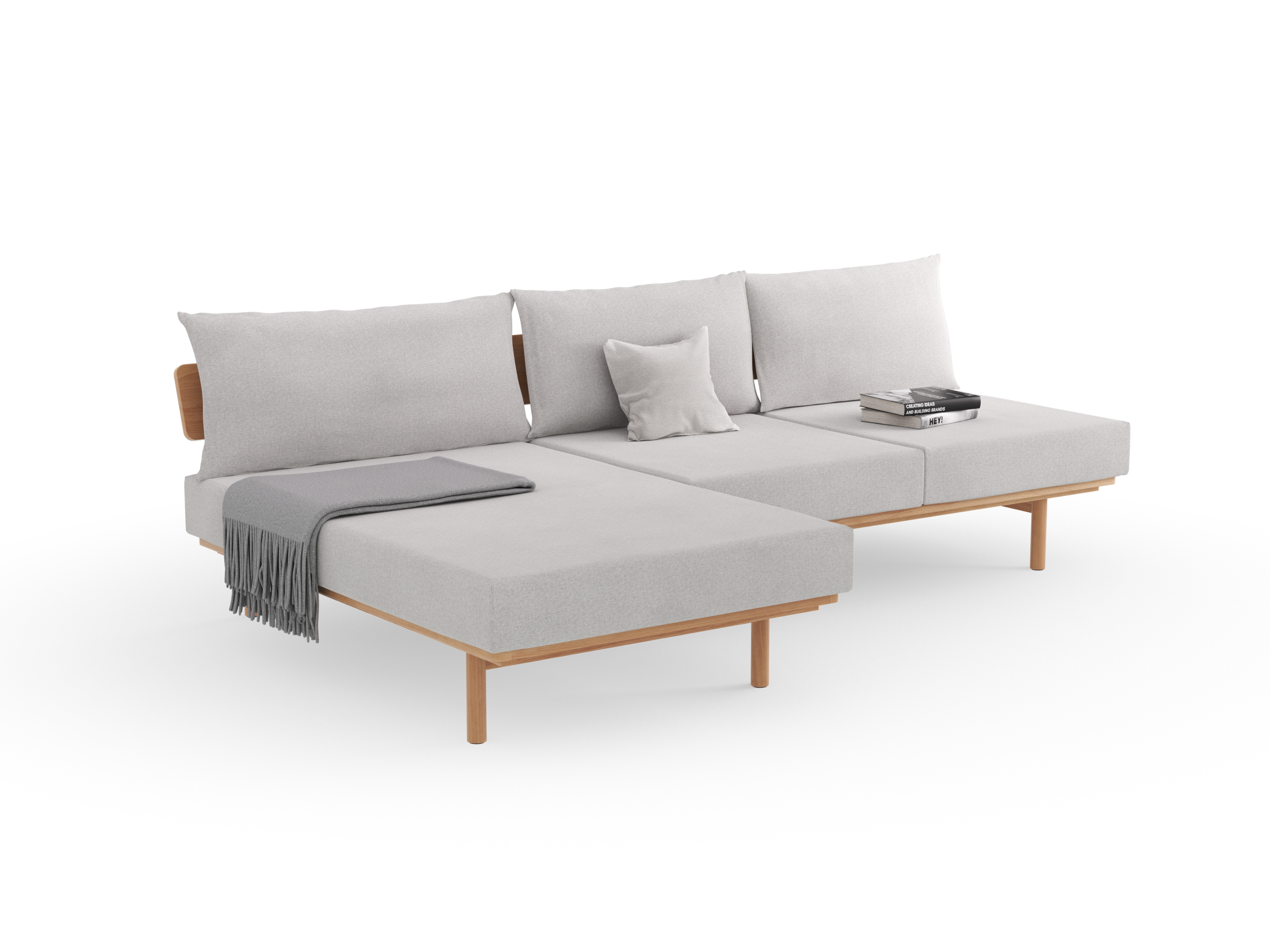 Loungesofa Lana, 260 x 160 cm mit Liegeteil links/rechts, Wollstoff Kaland Kiesel (68), Buche