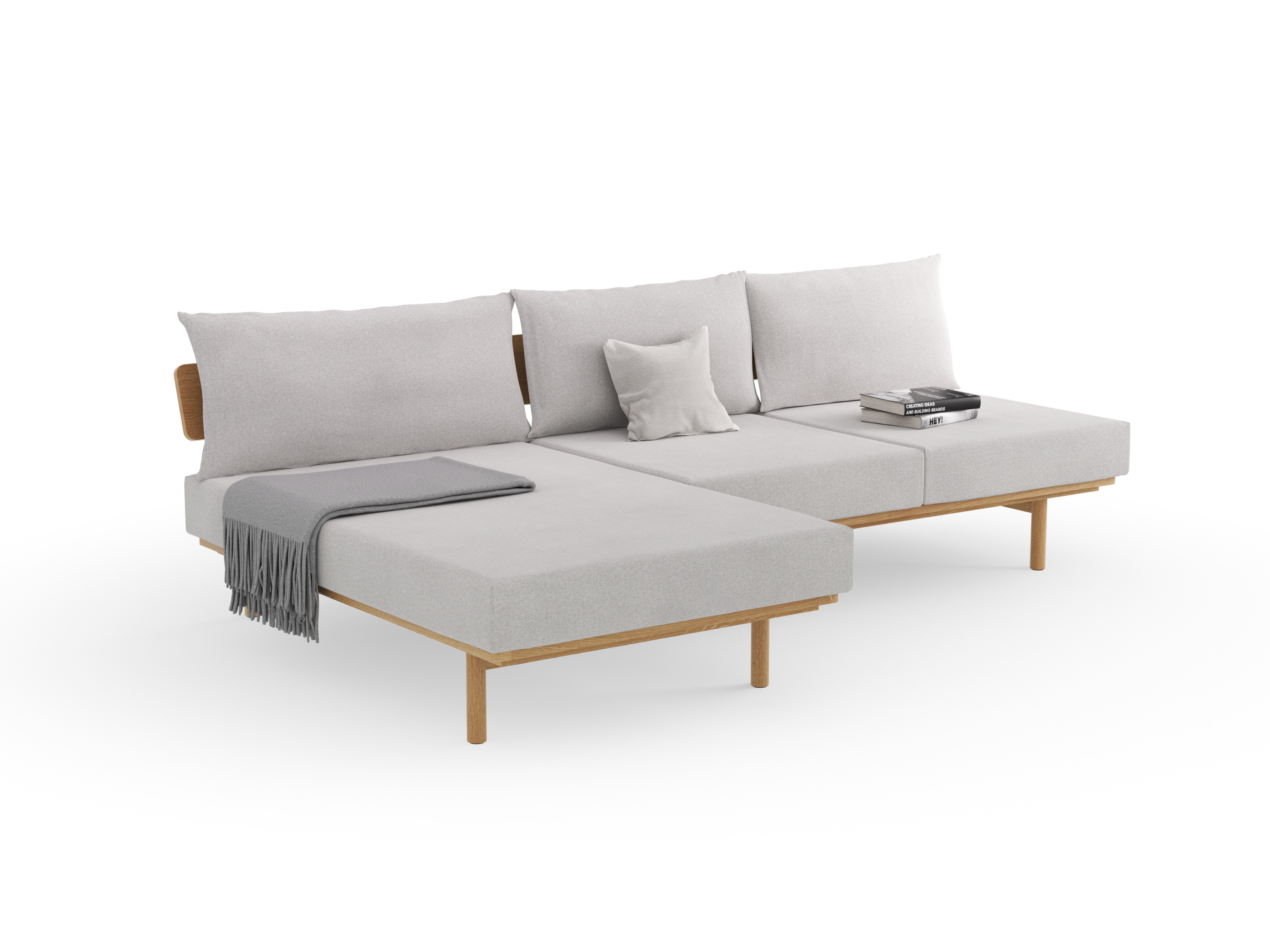 Loungesofa Lana, 260 x 160 cm mit Liegeteil links/rechts, Wollstoff Kaland Kiesel (68), Eiche