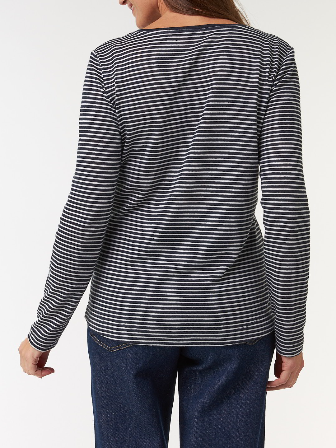 Figurumspielendes Langarm-Shirt in edler Leinen-Baumwoll-Jersey-Qualität. Die feine Ringel-Dessinierung erhält durch die kontrastfarbene Halsleiste am V-Ausschnitt einen modernen Akzent. Eine anschmiegsamer Passform betont die feminine Silhouette – angenehm leicht und natürlich im Tragegefühl.