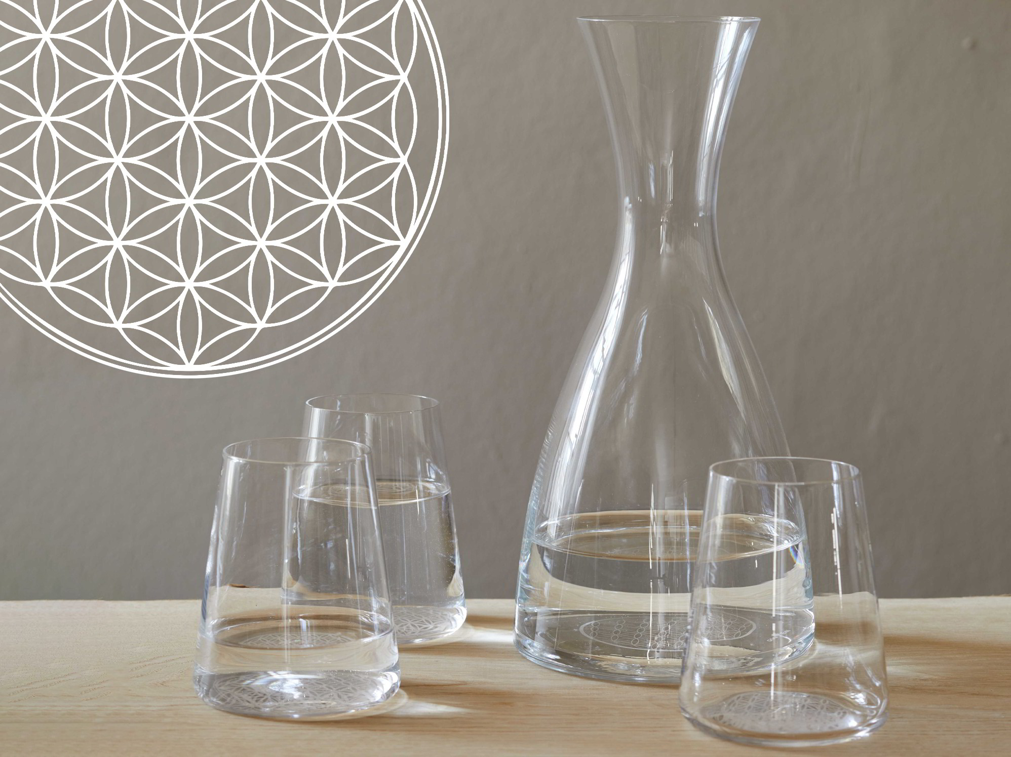 Die Gläser „Blume des Lebens“ sind sehr schön und passen perfekt zur Karaffe mit Korkverschluß!