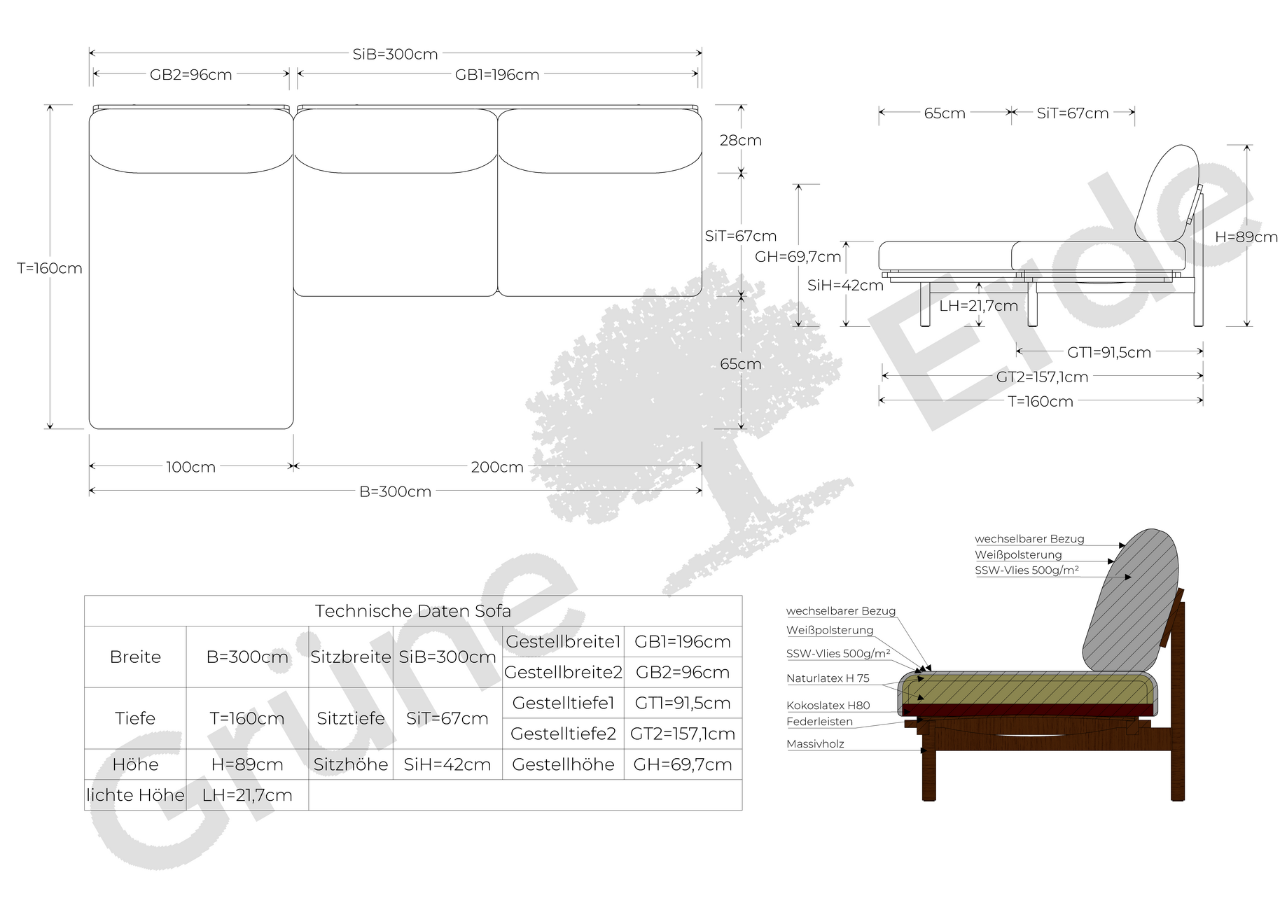 Sofa LanaMassivholz aus nachhaltig bewirtschafteten Wäldern, handwerklich erstklassig verarbeitet; fixverleimte Dübelverbindung; von Hand geölte Holzoberfläche. Sandwichartig aufgebaute Polsterung bestehend aus fest-elastischem Kokoslatex, weichem Naturlatex und Schafschurwollvlies.-