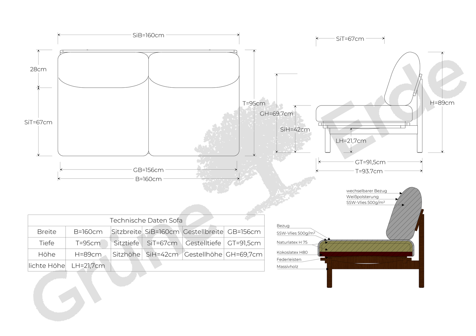 Sofa LanaMassivholz aus nachhaltig bewirtschafteten Wäldern, handwerklich erstklassig verarbeitet; fixverleimte Dübelverbindung; von Hand geölte Holzoberfläche. Sandwichartig aufgebaute Polsterung bestehend aus fest-elastischem Kokoslatex, weichem Naturlatex und Schafschurwollvlies.-