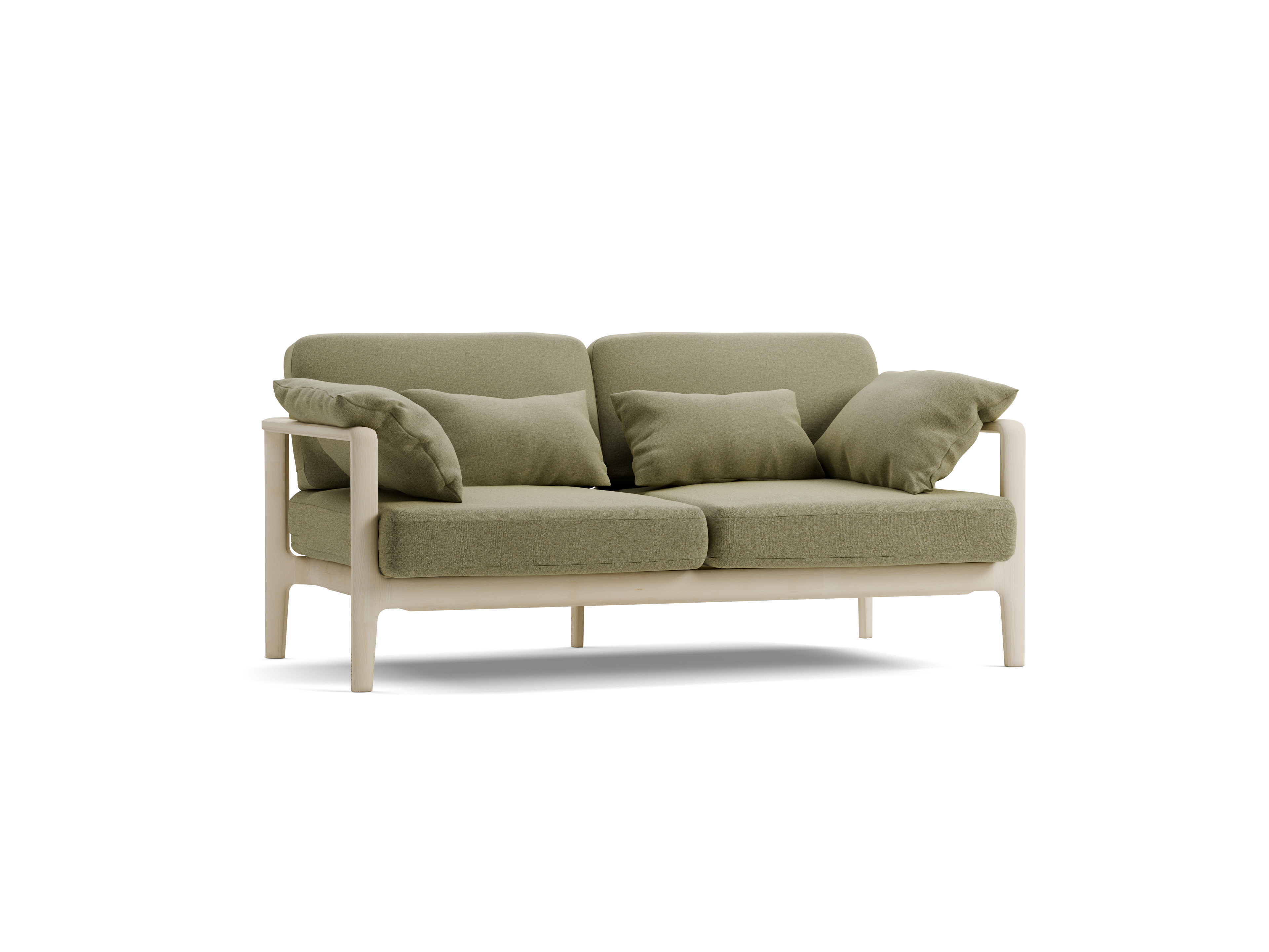 Der elegante, schlanke, feinsinnige Sofarahmen aus fix verleimtem Massivholz – mit sanften, verrundeten, fließenden Übergängen und Verbindungen – umfängt die Polsterelemente relingartig und gibt dem Sofa auch eine reizvolle Rückenansicht.-