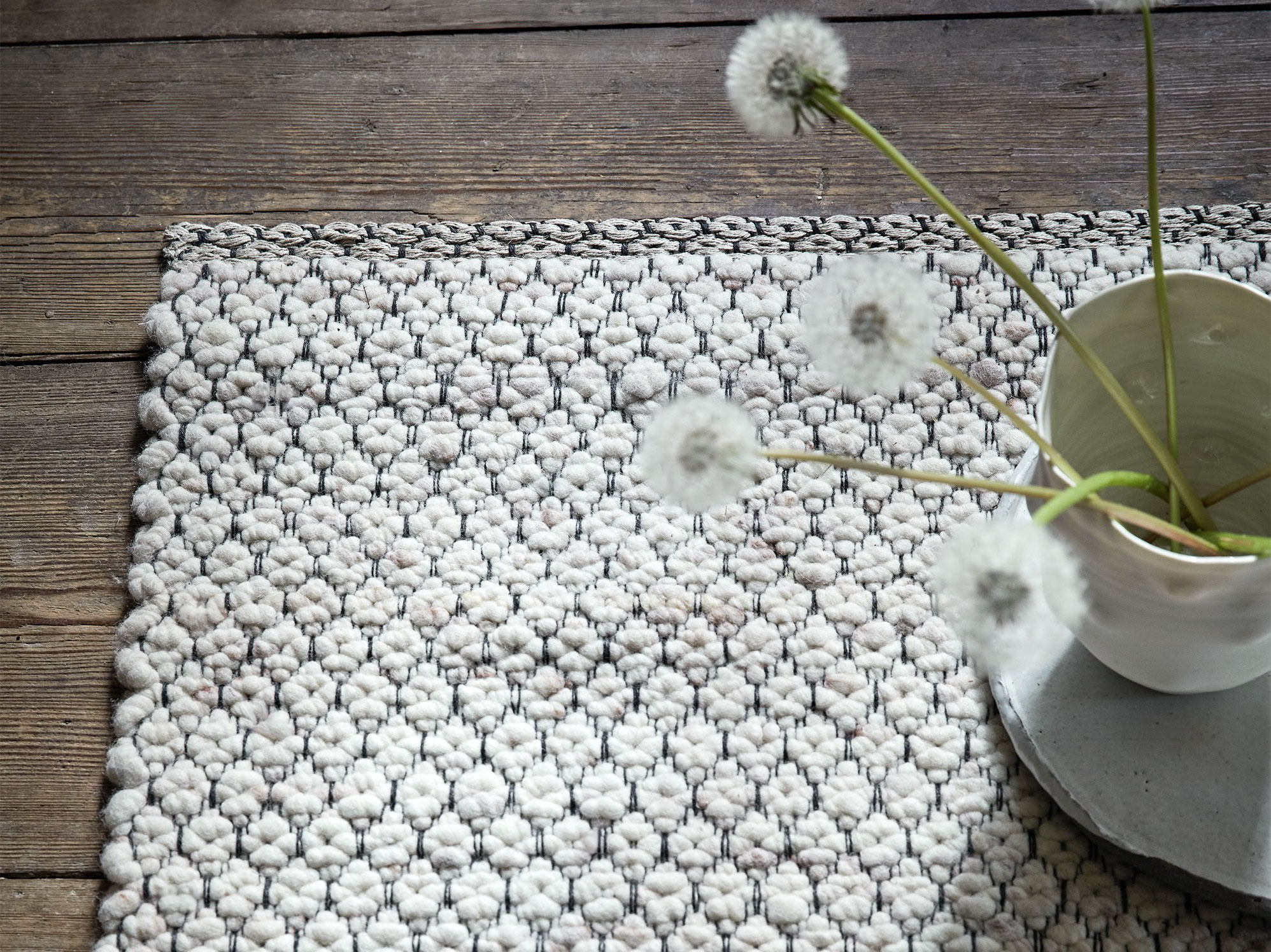 Schön flach und trotzdem weich. Verbreitet eine sehr behagliche Stimmung. Fusselt nicht ein bißchen und riecht so schön dezent nach Wolle. Muster macht optisch schön was her. Jederzeit wieder.