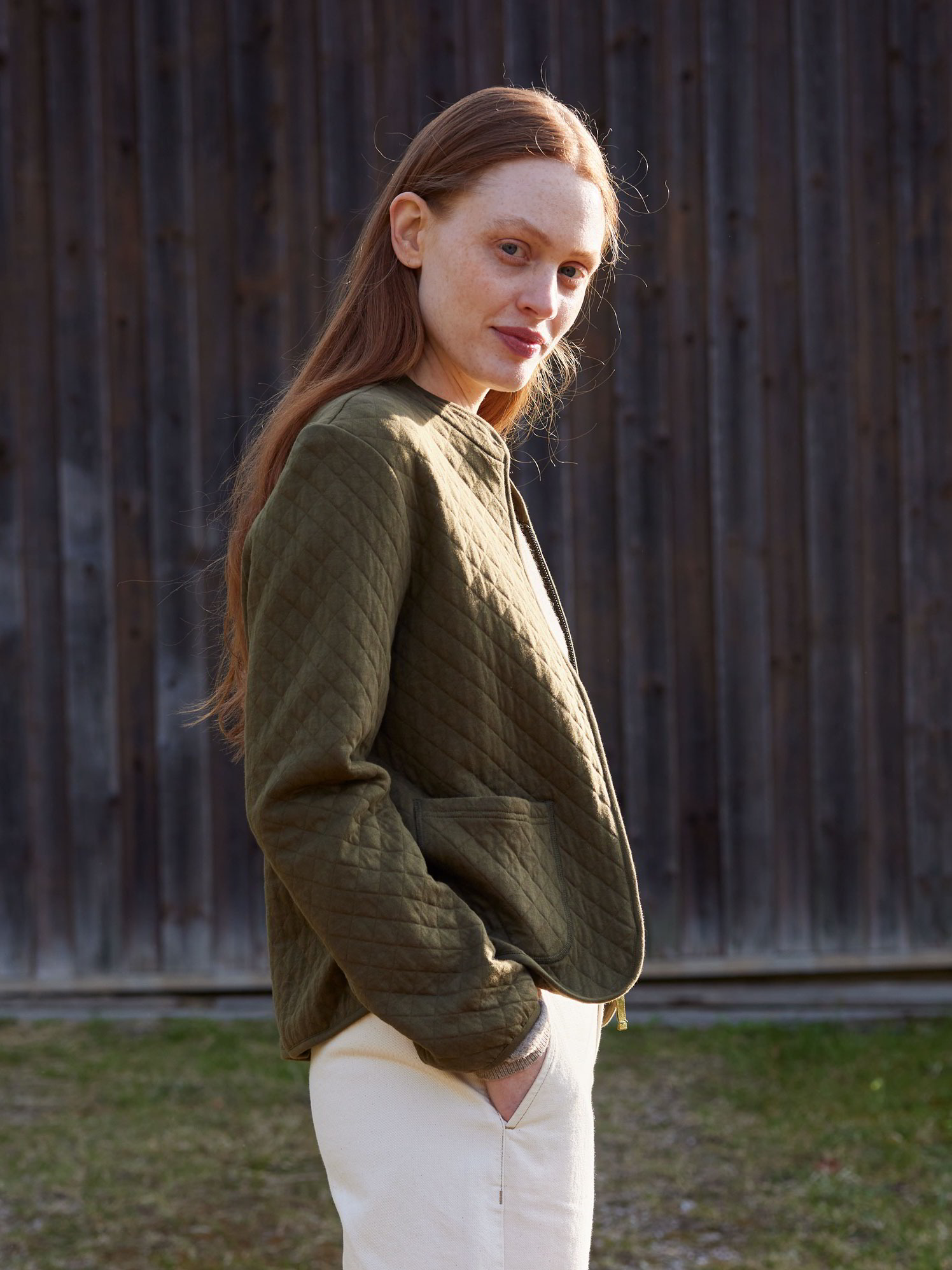Bereit für ein Abenteuer?Lässige Steppweste in softem Kaktus-Grün: mit langen Ärmeln, bequem und angenehm-weich im Griff. Der durchgehende Reißverschluss und zwei aufgesetzte Eingriffstaschen auf der Vorderseite sorgen für praktische Funktionalität, während das weiche Naturmaterial – reine Baumwolle kbA, GOTS-zertifiziert – in doubliertem Strukturjersey Natürlichkeit und Qualität verspricht. Ideal für den Lagen-Look an kühleren Tagen – ob unterwegs oder ganz entspannt zuhause. Mit Stehkragen und dezentem Logo-Patch auf der Innenseite.Schnitt: leger. In Größe S (36/38) ca. 62 cm lang. Unsere Models sind zwischen 175 cm und 177 cm groß und tragen Kleidergröße 36.Ökologisch & fair produziertDieses Kleidungsstück entsteht aus Baumwolle kbA und Wolle kbT. Es wird nach strengen Richtlinien – wie dem Global Organic Textile Standard – und nach größter ökologischer Sorgfalt bei unserem Partnerbetrieb gefertigt.Material: 100 % Baumwolle.Materialherkunft: Baumwolle kbA aus der Türkei. Gewirkt in Litauen. Gefertigt in Litauen nach dem GOTS. -