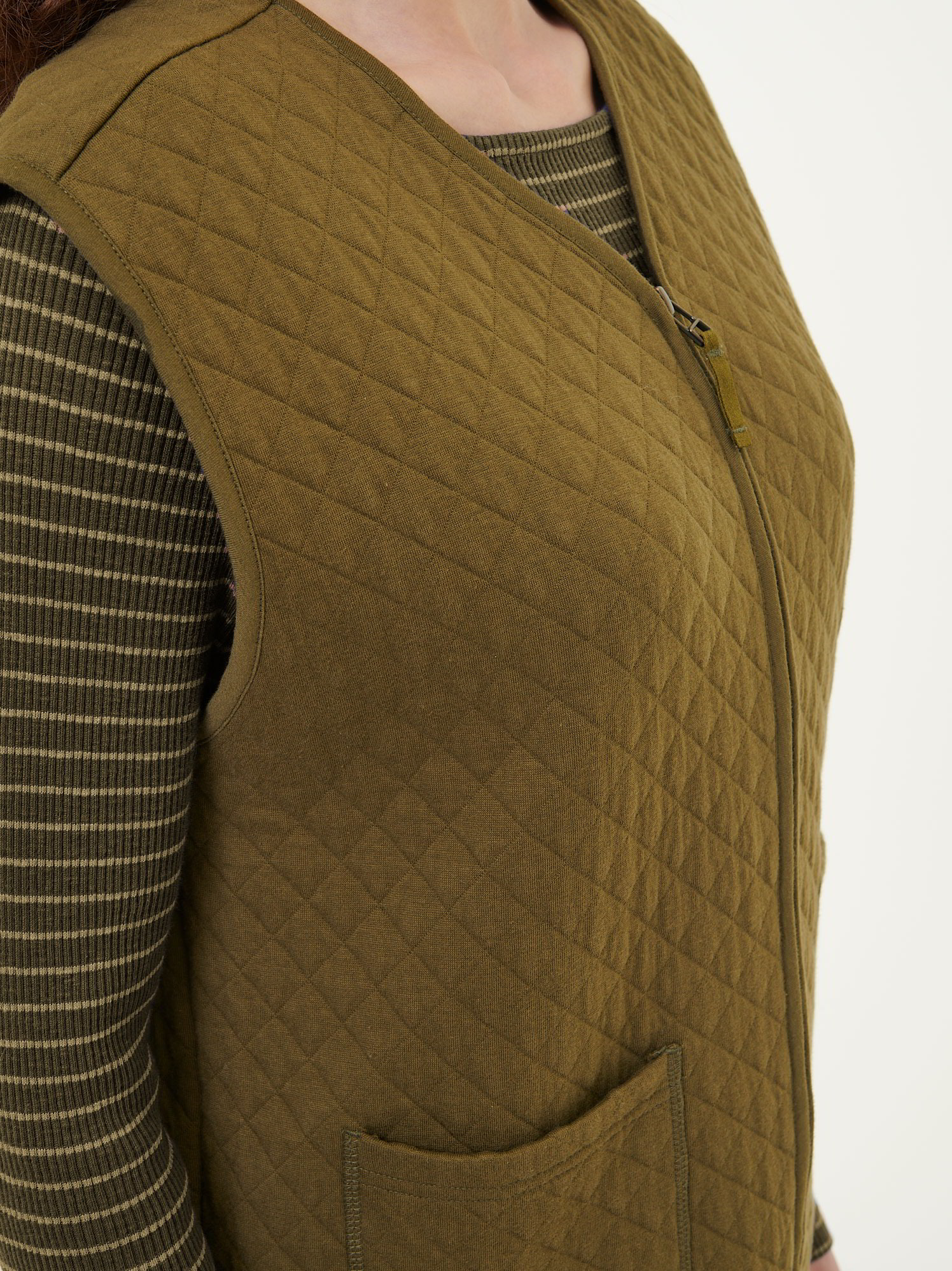 Bereit für ein Abenteuer?Lässige Steppweste in softem Kaktus-Grün: ärmellos, bequem und angenehm-weich im Griff. Der durchgehende Reißverschluss und zwei aufgesetzte Eingriffstaschen auf der Vorderseite sorgen für praktische Funktionalität, während das weiche Naturmaterial – reine Baumwolle kbA, GOTS-zertifiziert – in doubliertem Strukturjersey Natürlichkeit und Qualität verspricht. Ideal für den Lagen-Look an kühleren Tagen – ob unterwegs oder ganz entspannt zuhause. Mit dezentem Logo-Patch auf der Innenseite.Schnitt: leger. In Größe S (36/38) ca. 62 cm lang. Unsere Models sind zwischen 175 cm und 177 cm groß und tragen Kleidergröße 36.Ökologisch & fair produziertDieses Kleidungsstück entsteht aus Baumwolle kbA und Wolle kbT. Es wird nach strengen Richtlinien – wie dem Global Organic Textile Standard – und nach größter ökologischer Sorgfalt bei unserem Partnerbetrieb gefertigt.Material: 100 % Baumwolle.Materialherkunft: Baumwolle kbA aus der Türkei. Gewirkt in Litauen. Gefertigt in Litauen nach dem GOTS. -