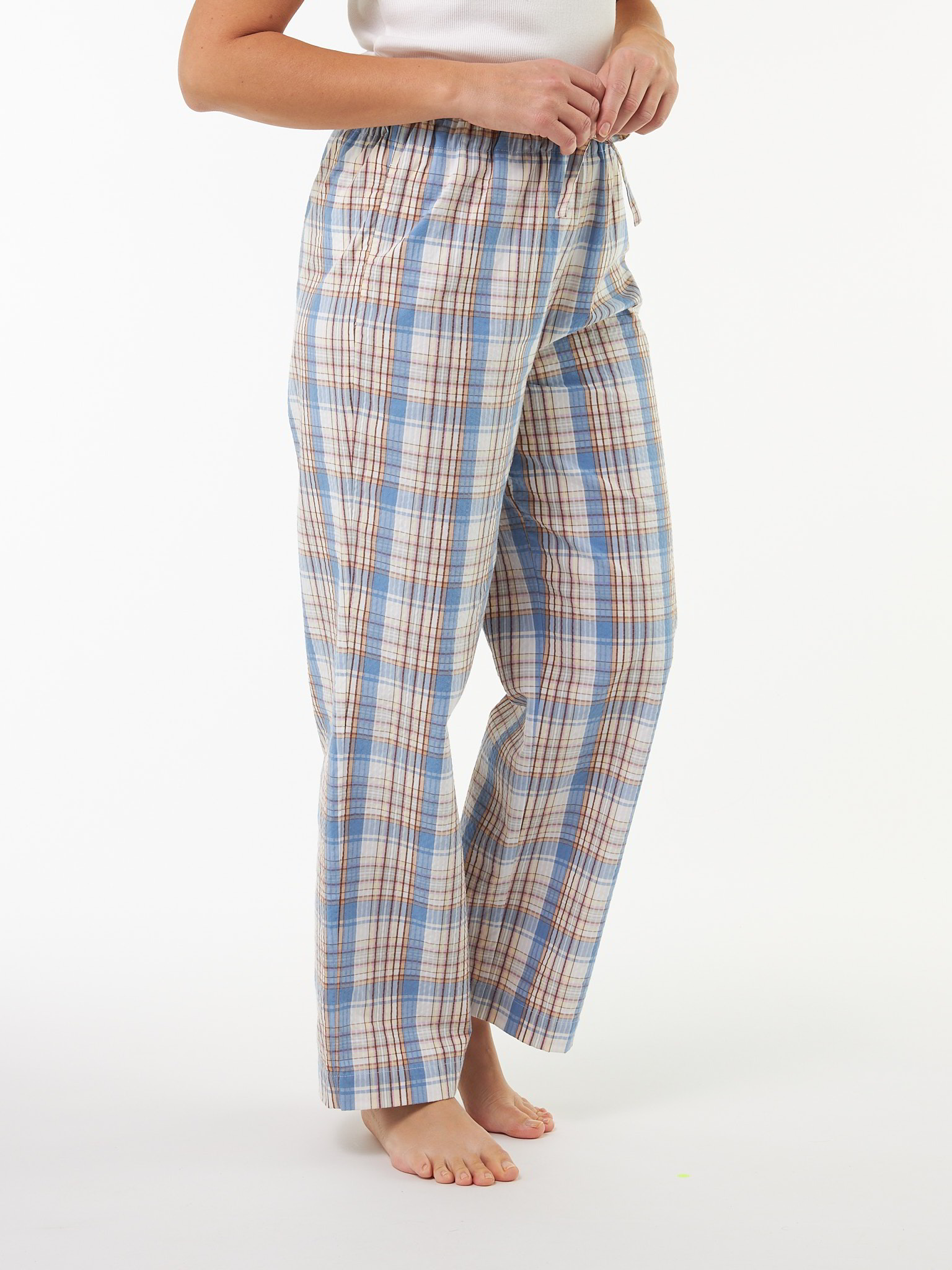 Leichte Schlafhose in ökologischer Seersucker-Qualität aus hautfreundlicher Baumwolle: luftig, bequem und wunderbar pflegeleicht. Das Modell zeigt sich mit schmalem Bein, elastischem Bund und integriertem Kordelzug für individuelle Weitenregulierung. Das charakteristische Karo-Dessin unterstreicht den natürlichen Charme der Seersucker-Struktur – ideal für erholsamen Schlaf und entspannte Stunden zu Hause.