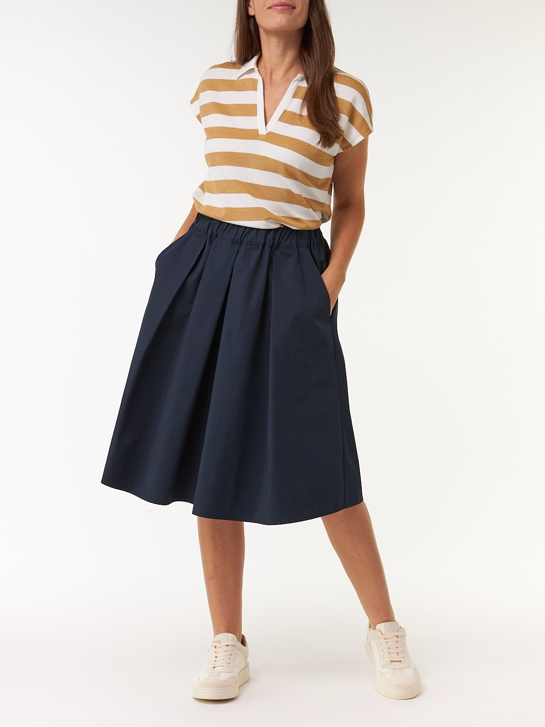Rock in sommerlicher Popeline-Qualität: Das Modell mit Gummibund und ausgestellter Rocklänge mit sportiven Falten sorgt für einen entspannten Casual-Fit. Zwei seitliche Eingriffstaschen unterstreichen die praktische Seite, während die leichte Qualität für optimalen Tragekomfort an warmen Tagen sorgt.