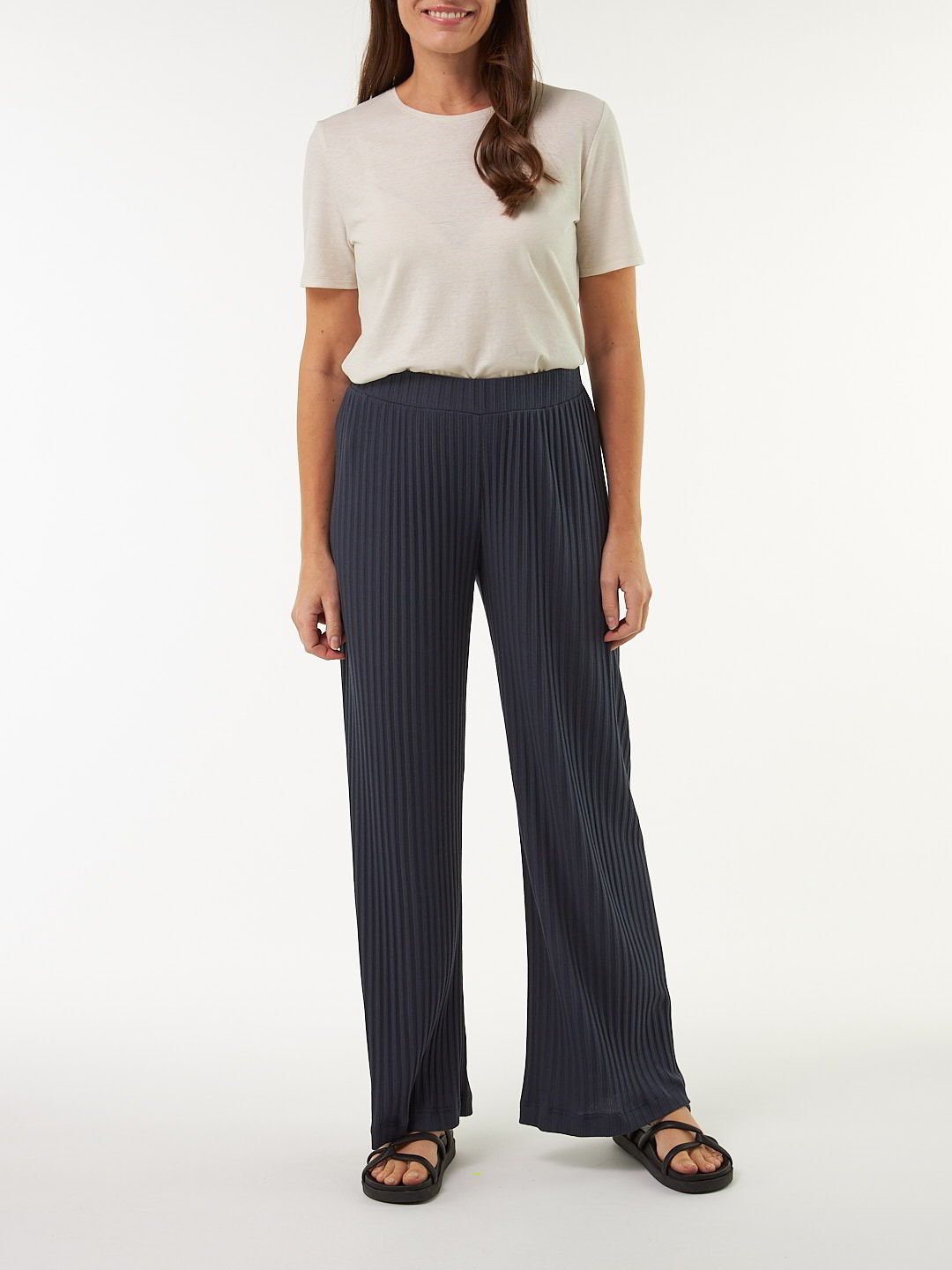 Fließende Hose aus hautfreundlicher Baumwolle kbA in markanter Breitripp-Struktur. Das Modell überzeugt mit elastischem Bund und weitem, locker fallendem Bein ohne Seitennaht, welches dem Look eine moderne Lässigkeit verleiht. Die klare Linienführung und die natürliche Materialqualität unterstreichen den puristischen Charakter. Eine vielseitige Hose – komfortabel, strukturiert und zeitlos schön.