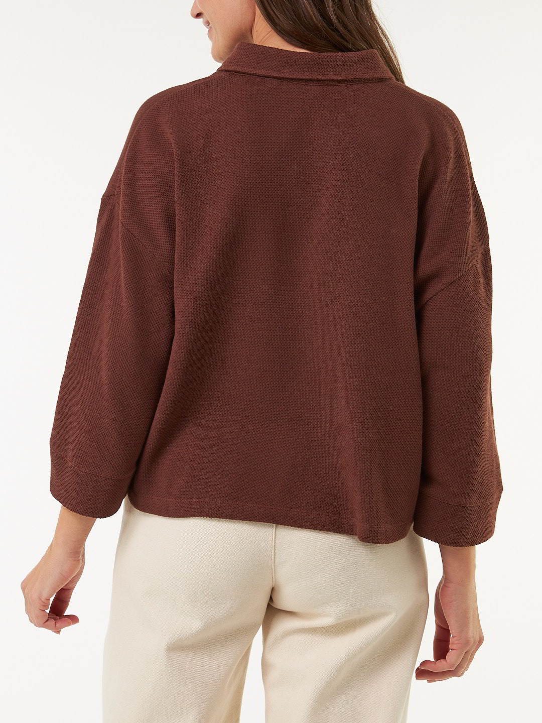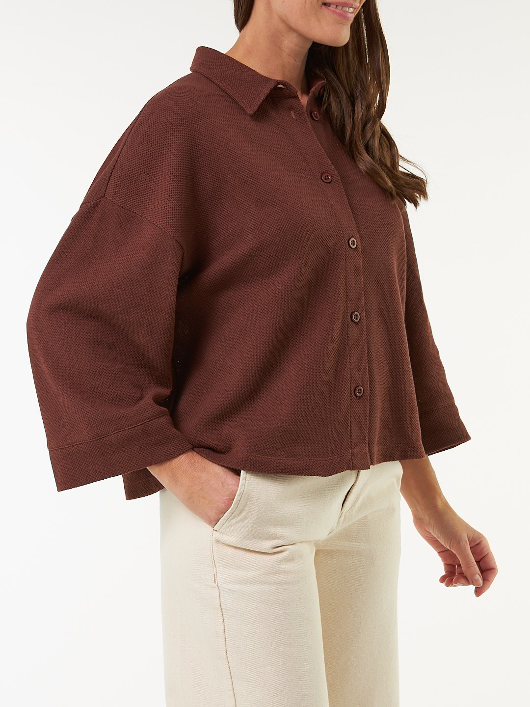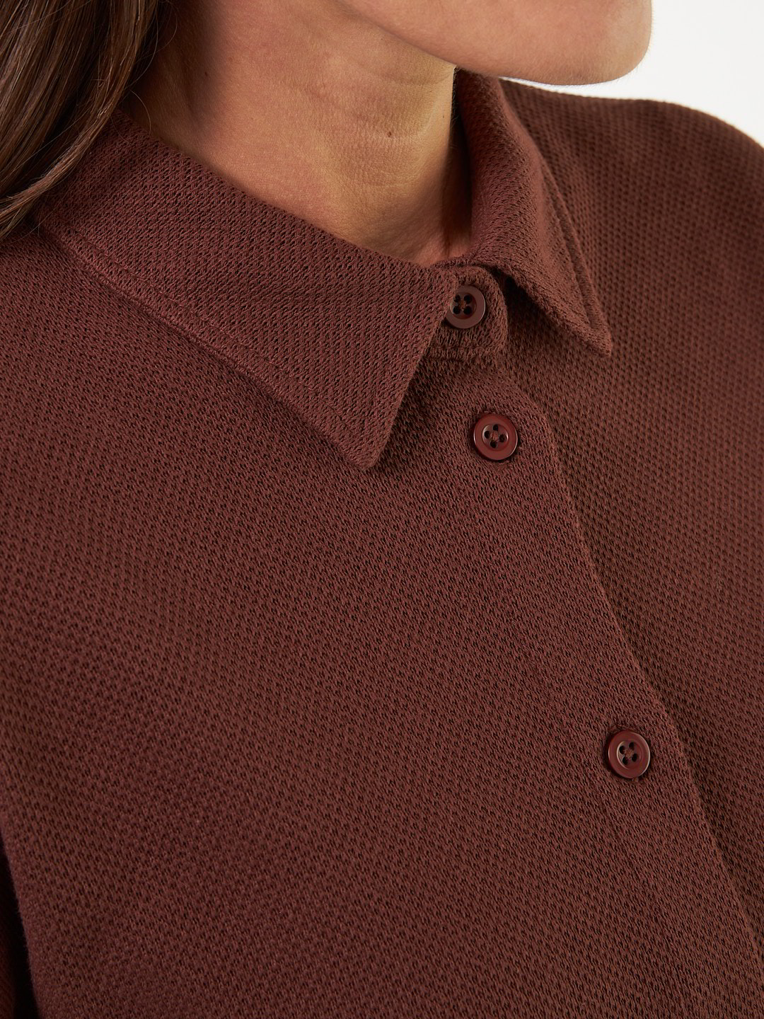 Leichtigkeit trifft StrukturDie Hemdbluse mit zarter Waffelstruktur sorgt dank der weichen, atmungsaktiven Baumwoll-Qualität für ein angenehmes Tragegefühl – ideal für alle Jahreszeiten. Die lockere Schnittführung mit überschnittenen Schultern, Kragen und durchgehender Knopfleiste verleiht der Bluse eine moderne, entspannte Silhouette. Ob als Shirtjacke, offen getragen über einem Top oder geschlossen als Statement-Piece – dieses vielseitige Kleidungsstück passt sich jedem Stil an. Der kastige Schnitt unterstreicht den puren, natürlichen Charakter der Serie.Schnitt: oversize. In Größe S (36/38) ca. 56 cm lang. Unsere Models sind zwischen 175 cm und 177 cm groß und tragen Kleidergröße S.Ökologisch & fair produziertEin schönes Stück Natur, welches wir nur zu gern tragen. Dieses Kleidungsstück entsteht aus Baumwolle kbA und wird nach strengen Richtlinien – wie dem Global Organic Textile Standard – bei unserem Partnerbetrieb gefertigt.Material: 100 % Baumwolle.Materialherkunft: Baumwolle kbA aus der Türkei. Gewirkt in der Türkei. Gefertigt in der Türkei nach dem GOTS. -