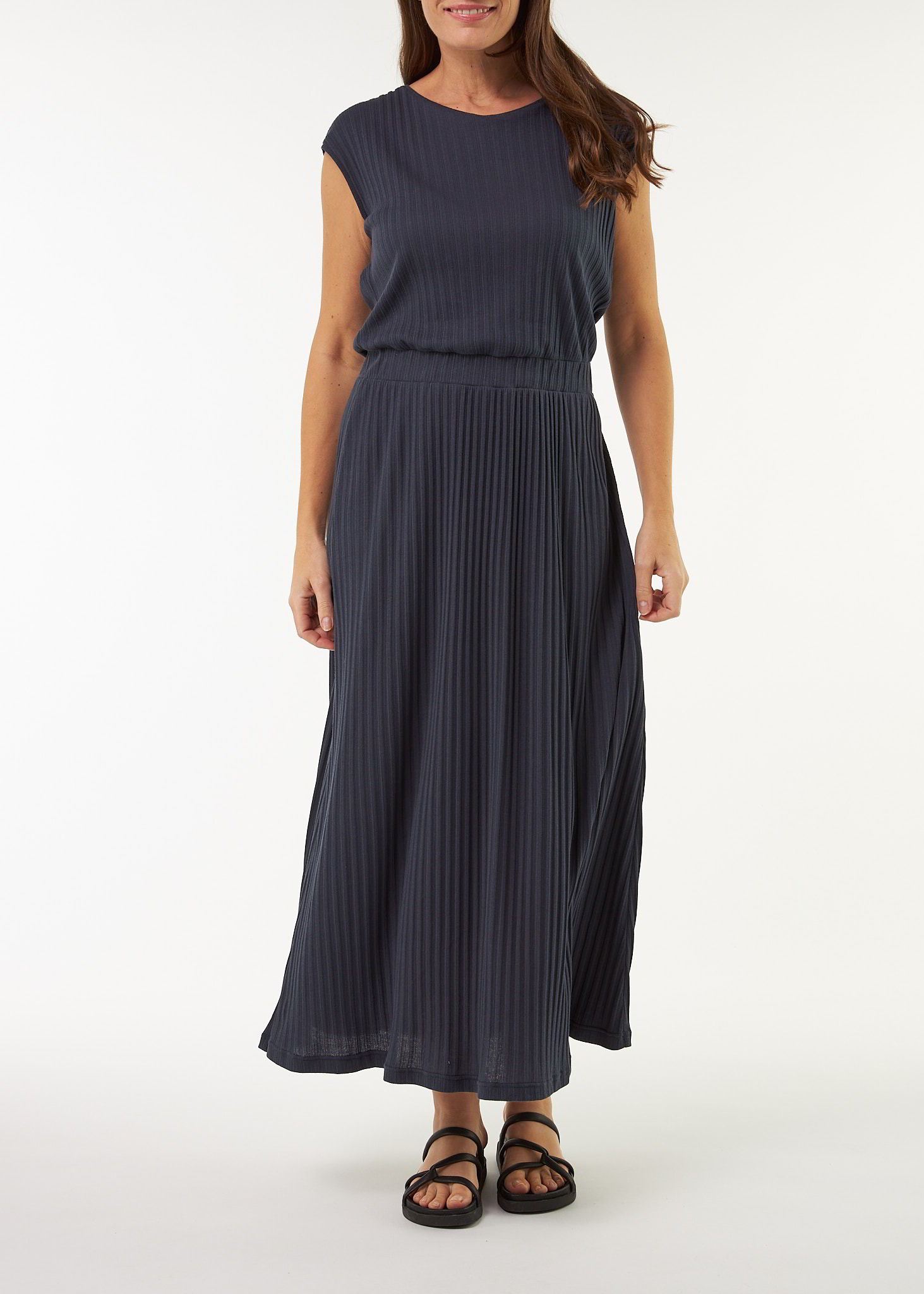 Fließendes Kleid aus hautfreundlicher Baumwolle kbA in markanter Breitripp-Struktur. Das Modell zeigt sich mit überschnittener Schulterpartie, Rundhalsausschnitt und einem breiten Gummibund in der Taille, der die weite Silhouette sanft formt. Der Rock fällt leicht ausgestellt bis zum Knöchel und unterstreicht den fließenden, modernen Look. Ein vielseitiges Kleid mit klarer Linienführung und natürlicher Materialqualität – pur, komfortabel und zeitlos schön.