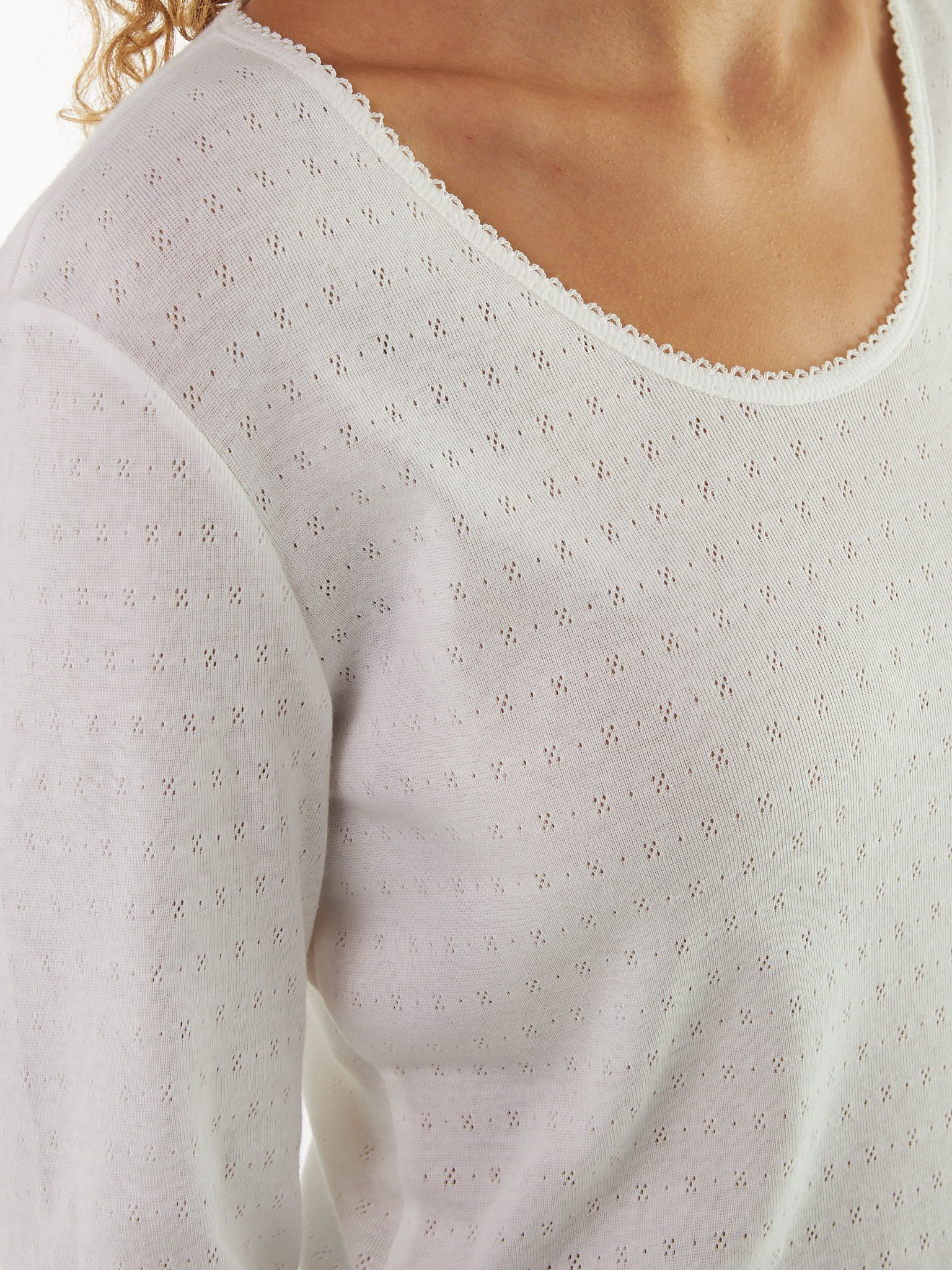 Für ein zartes Gefühl und eine feminine SilhouetteGarantiert ein Lieblingsstück: klassisches Langarm-Shirt aus hochwertiger, weicher Baumwolle. Das Modell mit der feinen Ajour-Dessinierung überzeugt mit seiner zarten Optik, dem weichen Griff und der hochwertigen Fertigung – garantiert ökologisch & sozial fair! Abgerundet wird das figurumspielende Shirt mit zarter Crochet-Kante entlang des Halsausschnitts.Schnitt: figurumspielend. In Größe S (36/38) ca. 64 cm lang. Unsere Models sind zwischen 175 cm und 177 cm groß und tragen Kleidergröße 36.Ökologisch & fair produziertEin schönes Stück Natur, welches wir nur zu gern tragen. Dieses Kleidungsstück entsteht aus Baumwolle kbA und wird nach strengen Richtlinien – wie dem Global Organic Textile Standard – bei unserem Partnerbetrieb gefertigt.Material: 100 % Baumwolle.Materialherkunft: Baumwolle kbA aus Griechenland. Gewirkt in Griechenland. Gefertigt in Bulgarien nach dem GOTS. -