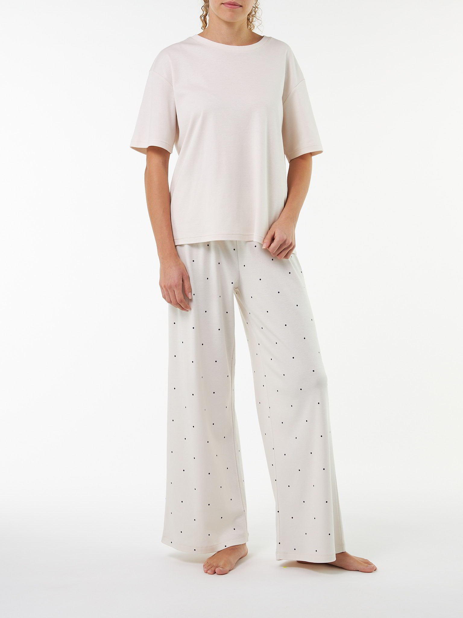 Kurzarm-Schlafshirt aus reiner Baumwolle in hochwertiger Interlock-Qualität – wunderbar weich im Griff, atmungsaktiv und angenehm auf der Haut. Die lockere, leicht oversize geschnittene Passform sorgt ein entspanntes Tragegefühl und ein angenehm-leichtes Gefühl auf der Haut. Schlicht und zeitlos als Uni-Variante oder mit feiner Punkte-Dessinierung garantiert dieses vielseitige Basic erholsame Nächte und gemütliche Stunden.