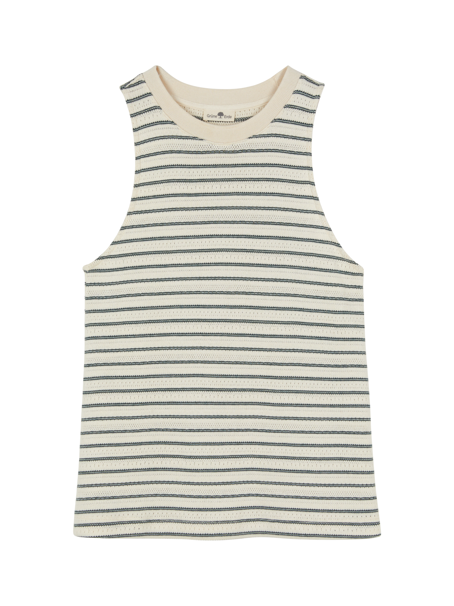 Feminin & zartÄrmelloses Top aus hochwertigem Ajour-Jersey – weich, angenehm auf der Haut und luftdurchlässig. Das Detail an der Halsleiste setzt einen eleganten Akzent, während die zarte Ringel-Dessinierung subtile Strukturen verleiht. Der locker fallende Schnitt sorgt für ein entspanntes, modernes Tragegefühl.Schnitt: leichte A-Linie. In Größe S (36/38) ca. 61 cm lang. Unsere Models sind zwischen 175 cm und 177 cm groß und tragen Kleidergröße S.Ökologisch & fair produziertEin schönes Stück Natur, welches wir nur zu gern tragen. Dieses Kleidungsstück entsteht aus weicher Baumwolle kbA und wird nach strengen Richtlinien – wie dem Global Organic Textile Standard – bei unserem Partnerbetrieb gefertigt.Material: 100 % Baumwolle.Materialherkunft: Baumwolle kbA aus der Türkei. Gewirkt in Portugal. Gefertigt in Portugal nach dem GOTS. -