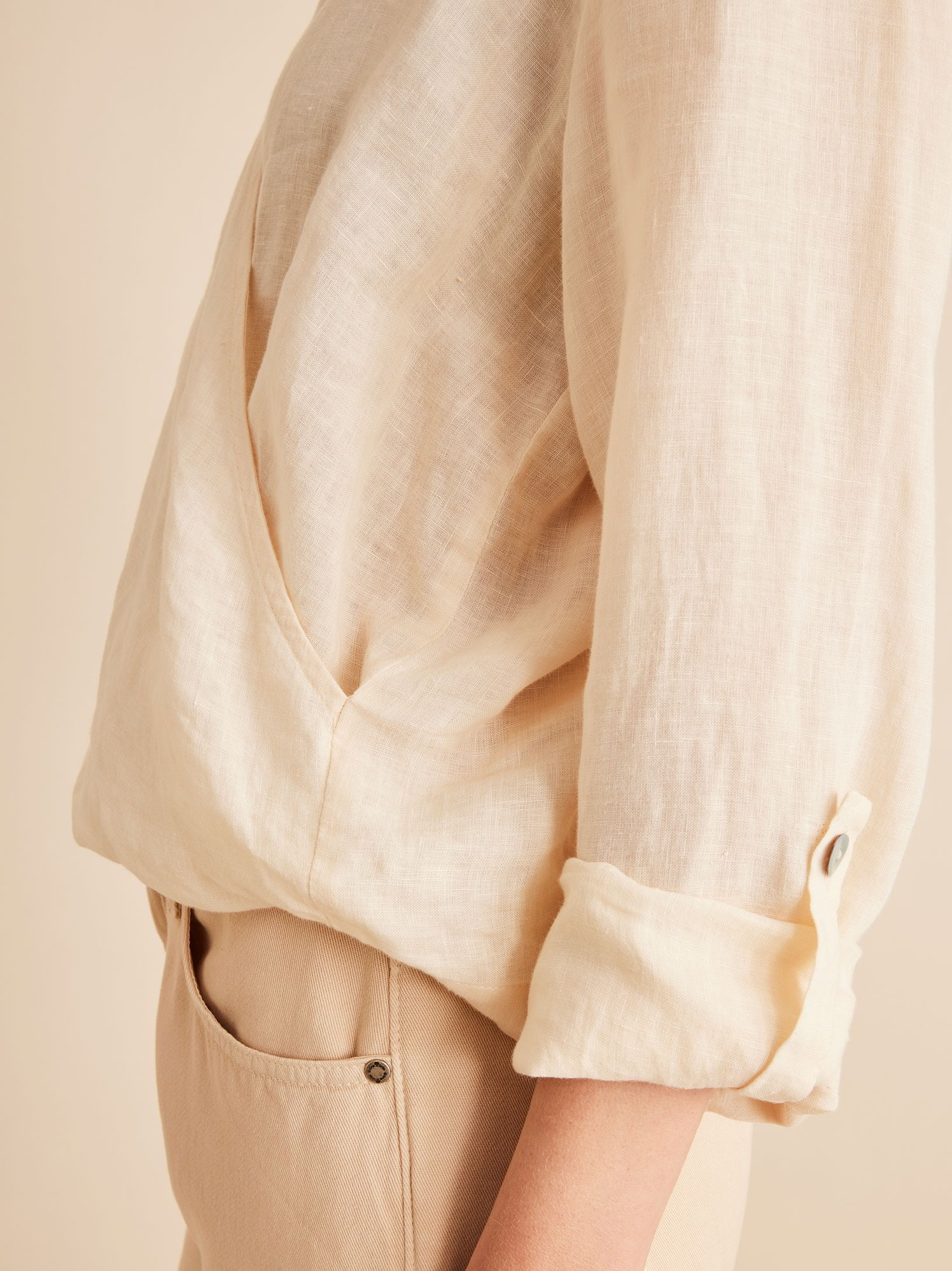Zeitlos, feminin und elegant: Diese Bluse entsteht aus edlem Leinen, welches bei unserem Partnerbetrieb in Österreich sorgfältig gewebt und in der Tschechischen Republik mit kleinen, liebevollen Details versehen wird. Das Kleidungsstück in Wickeloptik kann als Solist oder in Kombination mit einem Top getragen werden. Die Bluse mit der Rückenpasse hat eine kurze Länge und ist sehr locker geschnitten.Details: Die Ärmellänge lässt sich über eine Ärmellasche mit Knopf variieren.Schnitt: leger. In Größe 36 ca. 58 cm lang.Unsere Models sind zwischen 175 cm und 177 cm groß und tragen Kleidergröße 36.Verarbeitung: 100 % Leinen. Leinen aus Frankreich.Gewebt in Österreich.Fair gefertigt in der Tschechischen Republik. -