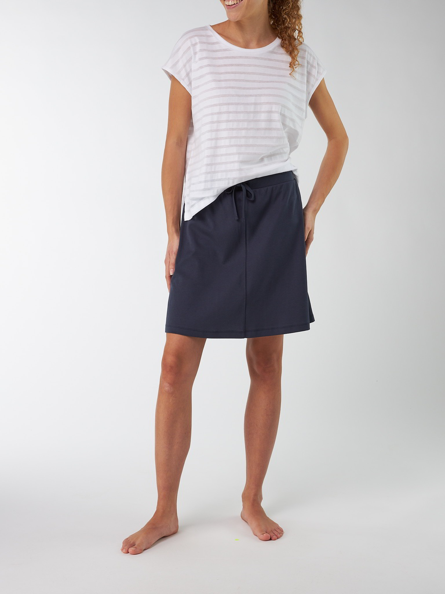 A-Linien-Rock in feiner Interlock-Qualität – weich und angenehm leicht auf der Haut. Der breite Bund mit Kordelzug sorgt für bequemen Sitz, während integrierte Shorts zusätzliche Bewegungsfreiheit bieten. Ziernähte vorne und eine Mittelnaht hinten betonen die moderne, sportlich-feminine Silhouette.