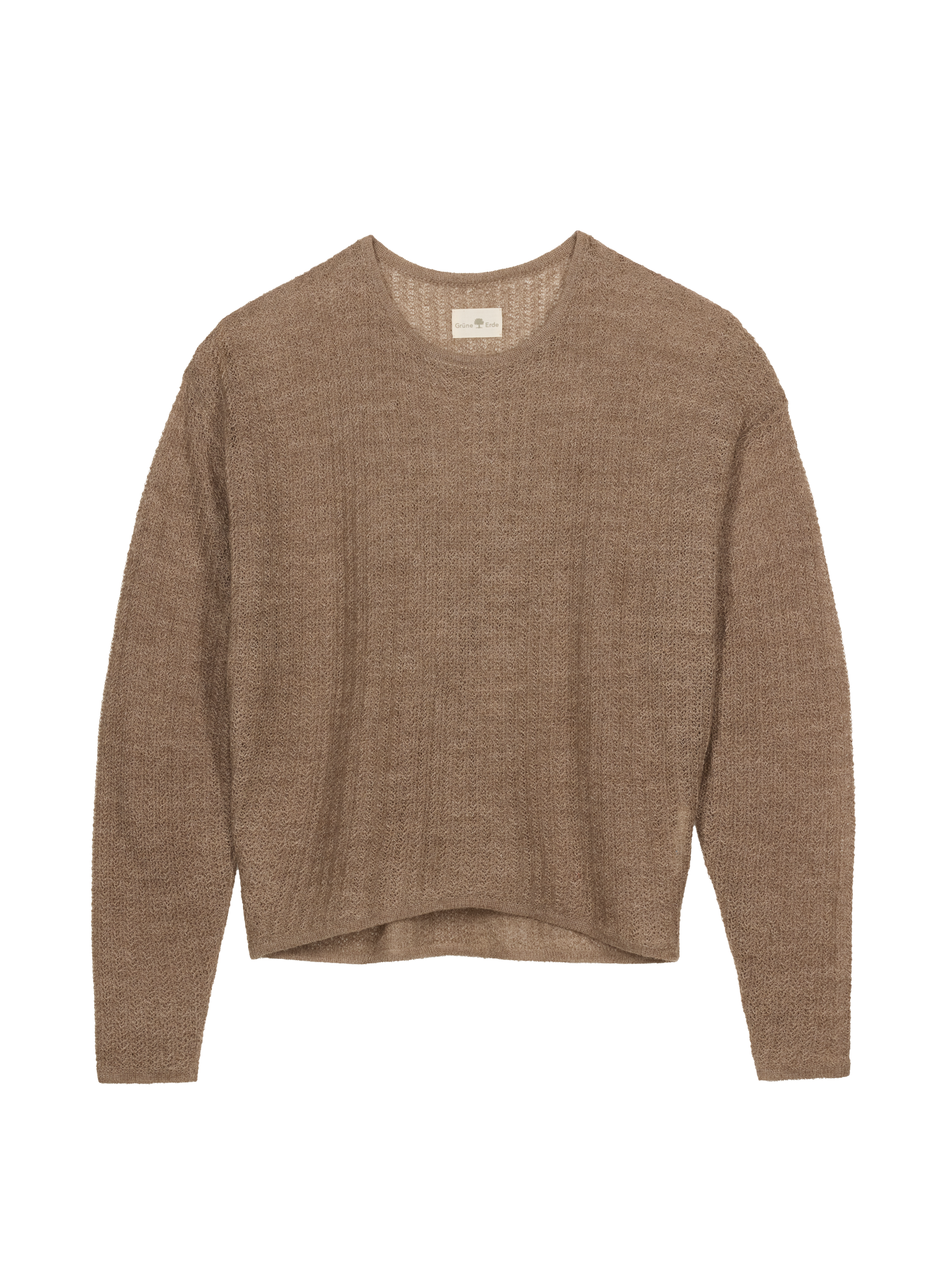 Ein Must-Have für die kühlere SaisonWarmer Strickpullover in hochwertiger Bouclé-Qualität mit weichem Griff – gefertigt aus reiner Alpakawolle.Die natürlichen Fasern verleihen ihm nicht nur eine edle Haptik, sondern auch eine lebendige, tief wirkende Farbigkeit – ganz ohne künstliche Effekte. Die strukturierte Oberfläche verleiht dem Modell Tiefe und Ausdruck .Schnitt: oversize. In Größe S (36/38) ca. 59 cm lang. Unsere Models sind zwischen 175 cm und 177 cm groß und tragen Kleidergröße S.Ökologisch & fair produziertEin schönes Stück Natur, welches wir nur zu gern tragen. Dieses Kleidungsstück entsteht aus edler Alpakawolle und wird in größter ökologischer Sorgfalt bei unserem Partnerbetrieb gefertigt. Die gesamte Wertschöpfung bleibt im Land der Rohfaser – fair gegenüber Mensch, Tier und Natur. Um die Langlebigkeit des Naturproduktes zu erhalten, empfehlen wir einen sorgsamen und wertschätzenden Umgang im alltäglichen Gebrauch.Material: 100 % Alpakawolle.Materialherkunft: Alpakawolle aus Peru. Gestrickt in Peru. Gefertigt in Peru. -