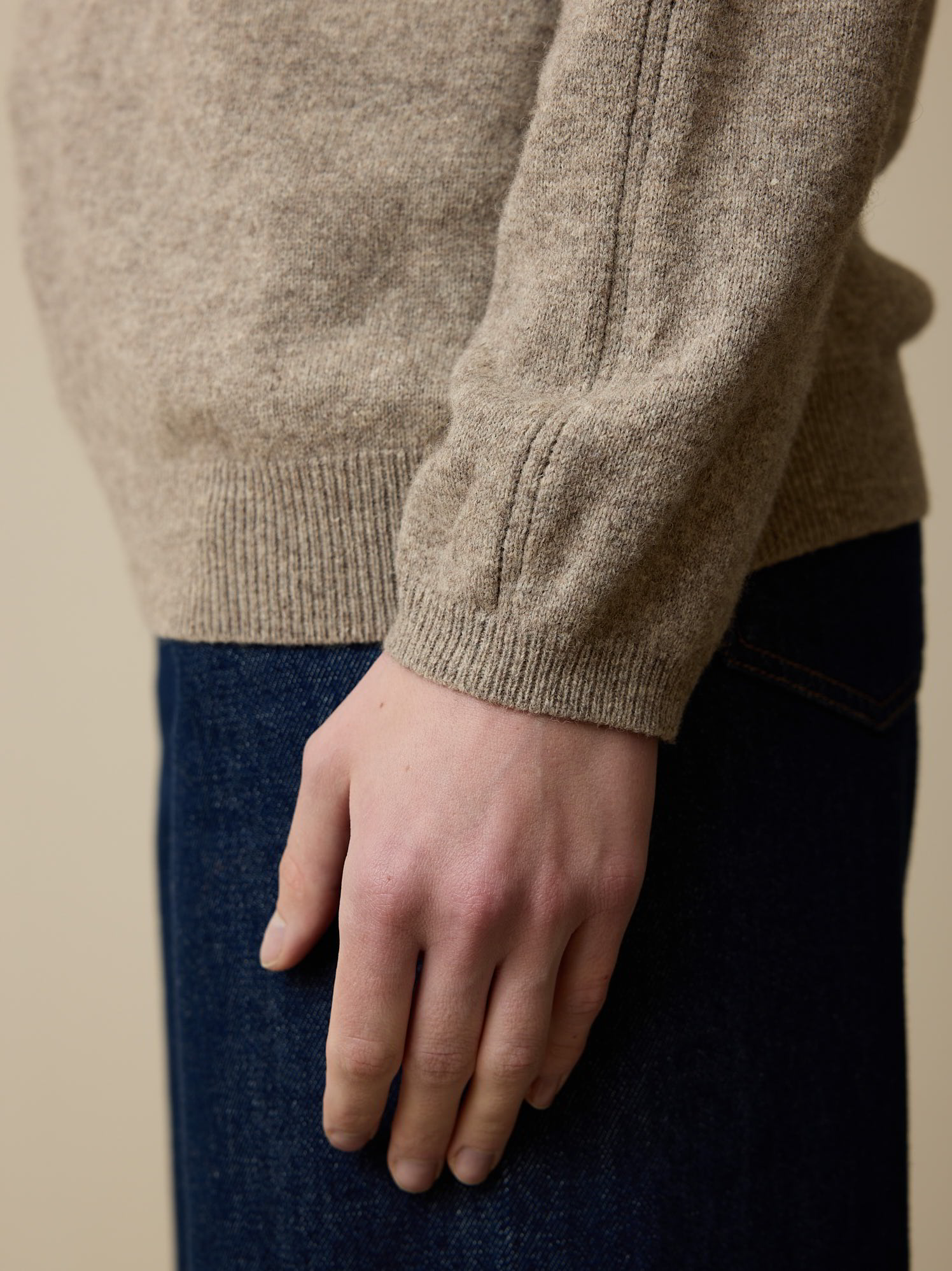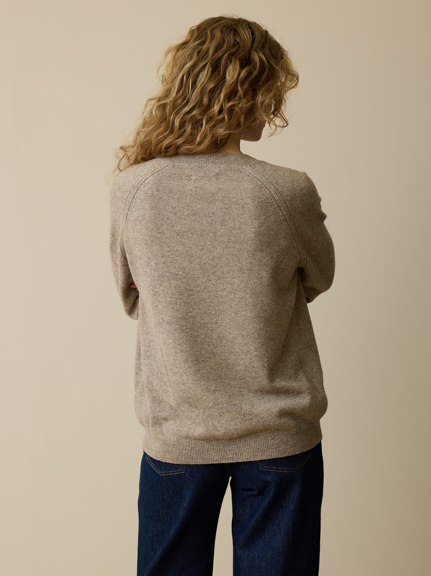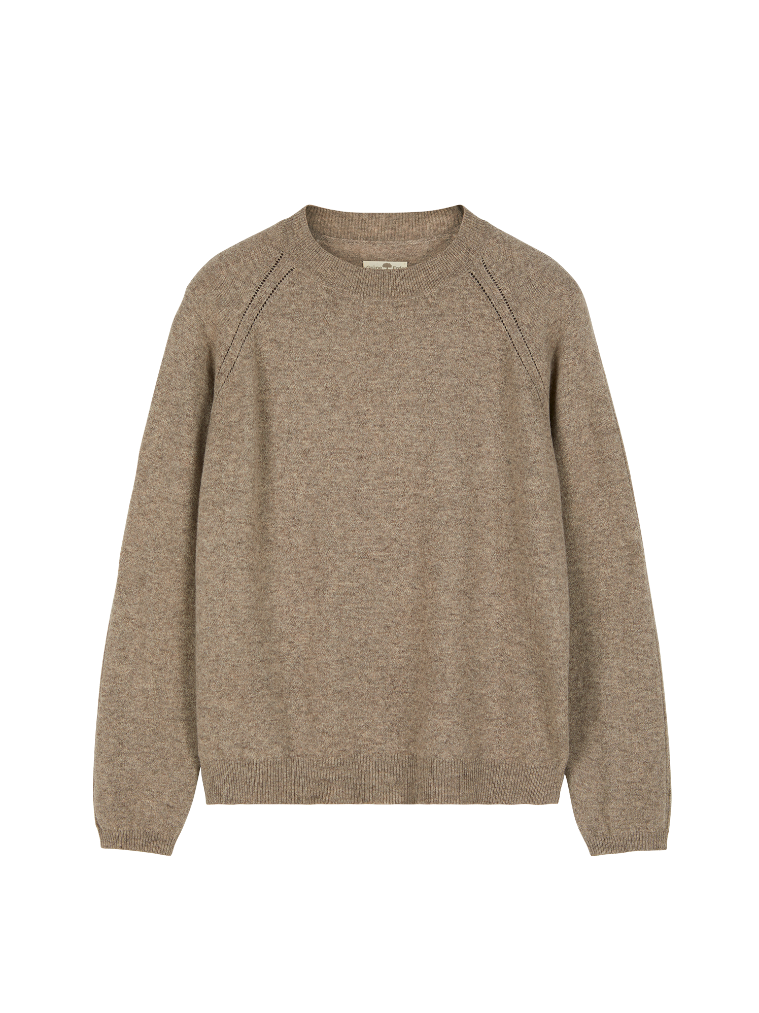 Schlichte Eleganz zum Wohlfühlen und KombinierenMehr als nur Komfort: Dieser Feinstrick-Pullover vereint Natürlichkeit, Qualität und Langlebigkeit. Das cleane Modell mit dem femininen Ajour-Detail entlang der Raglannähte ist ein wahrlich schöner Allrounder. Hochwertig verarbeitet entsteht dank der Kombination aus ungefärbtem Yakhaar und wärmend-weicher Schurwolle ein besonders natürlicher Tragekomfort. Der klassisch geschnittene Rundhalspullover wird mit schmalen Ärmeln und feinen Ripp-Details an den Abschlüssen komplettiert.Schnitt: leger. In Größe S (36/38) ca.62 cm lang. Unsere Models sind zwischen 175 cm und 177 cm groß und tragen Kleidergröße S.Ökologisch & fair produziertEin schönes Stück Natur, welches wir nur zu gern tragen. Dieses Kleidungsstück entsteht aus der Kombination von wertvollem Yakhaar sowie wärmender Schurwolle und wird in größter ökologischer Sorgfalt bei unserem Partnerbetrieb gefertigt. Die gesamte Wertschöpfung bleibt im Land der Rohfaser – fair gegenüber Mensch, Tier und Natur. Um die Langlebigkeit des Naturproduktes zu erhalten, empfehlen wir einen sorgsamen und wertschätzenden Umgang im alltäglichen Gebrauch.Material: 50 % Yakhaar, 50 % Schurwolle.Materialherkunft: Yakhaar aus der Mongolei. Schurwolle aus der Mongolei. Gestrickt in der Mongolei. Gefertigt in der Mongolei. -