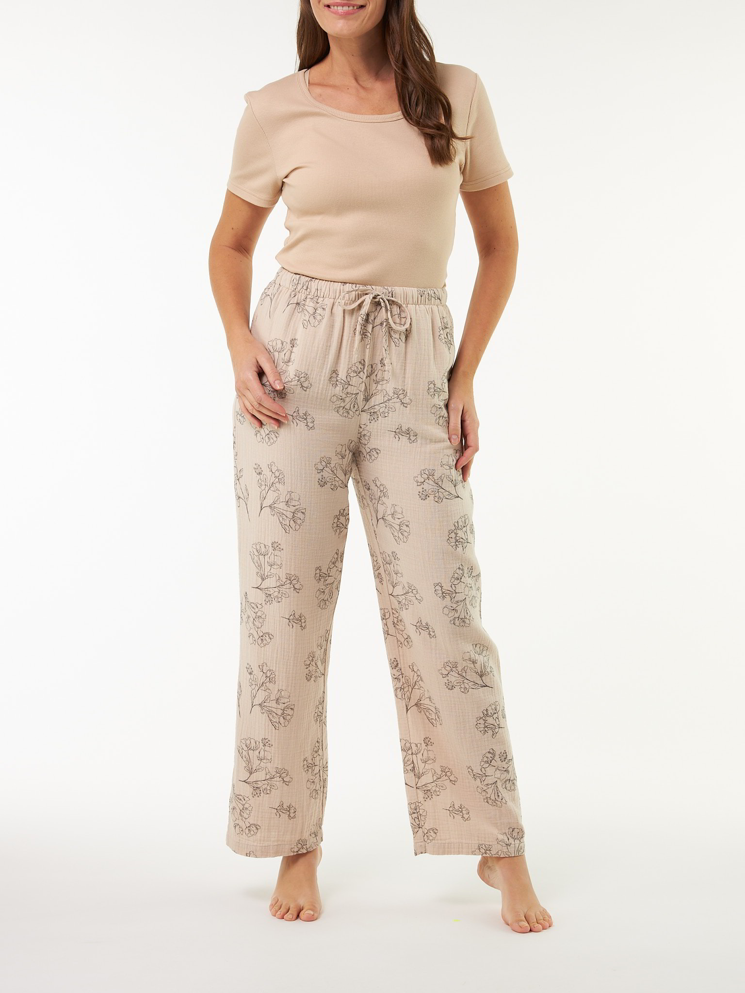 Pyjama-Hose aus zarter Musselin-Qualität mit feinem Druck: weich, angenehm luftig und leger im Fall. Der schmale Gummibund mit Kordelzug bietet bequemen Sitz, während der weite, lange Schnitt für Komfort und Bewegungsfreiheit sorgt – ein unkompliziertes Basic für entspannte Stunden.