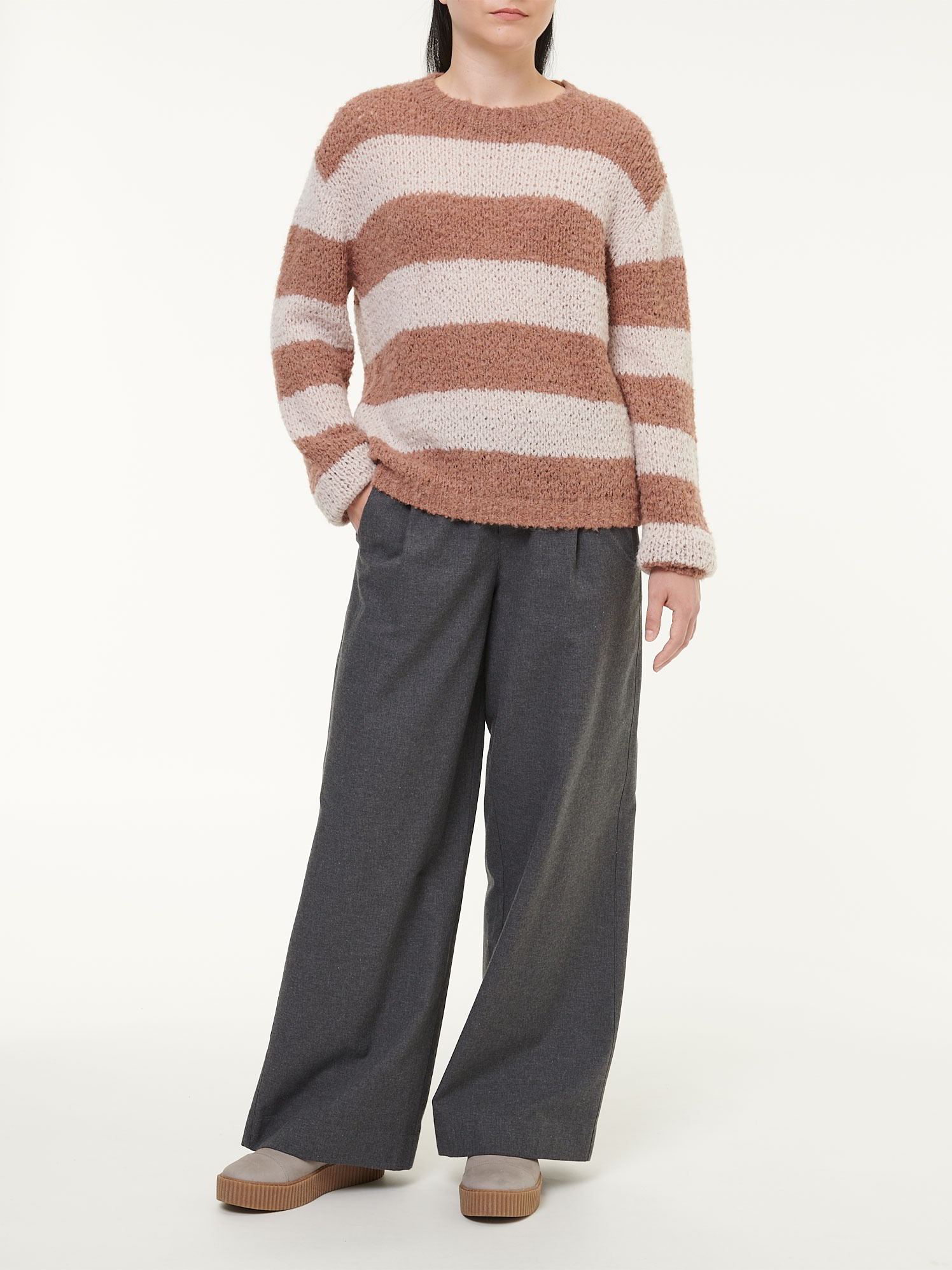 Warmer Strickpullover in hochwertiger Bouclé-Qualität mit weichem Griff – gefertigt aus reiner Alpakawolle.Die natürlichen Fasern verleihen ihm nicht nur eine edle Haptik, sondern auch eine lebendige, tief wirkende Farbigkeit – ganz ohne künstliche Effekte. Die strukturierte Oberfläche verleiht dem Modell Tiefe und Ausdruck .
