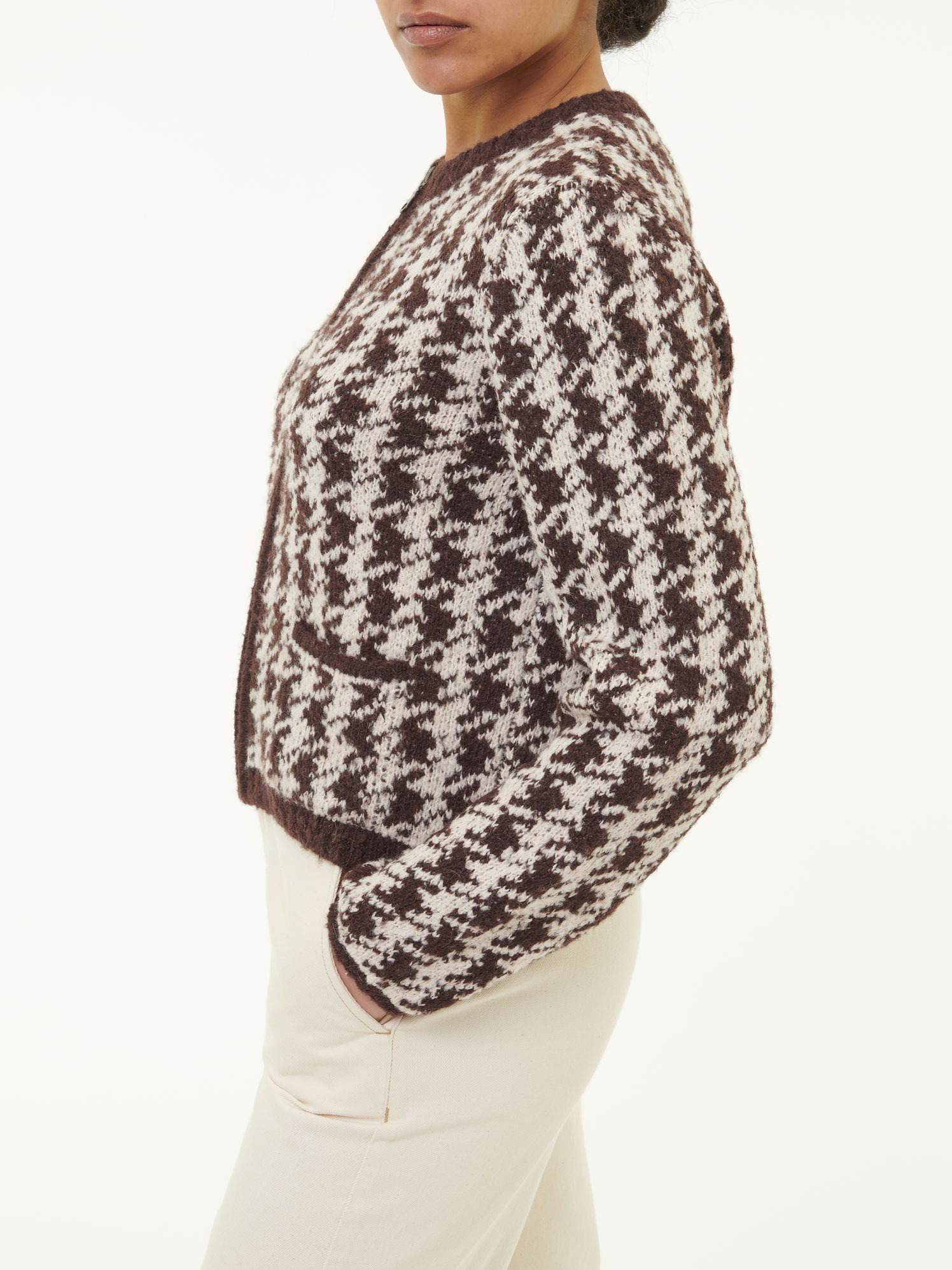 Alpakawolle trifft Bouclé-CharmeWarme Strickjacke in hochwertiger Bouclé-Qualität mit weichem Griff – gefertigt aus reiner Alpakawolle. Der markante Hahnentritt in Kombination mit einer legeren Passform wirkt stilvoll, gemütlich und zeitlos. Zwei Leistentaschen und ein Reißverschluss unterstreichen den lässigen Charakter, während die strukturierte Oberfläche dem Modell Tiefe und Ausdruck verleiht.Schnitt: leger. In Größe S (36/38) ca. 54 cm lang. Unsere Models sind zwischen 175 cm und 177 cm groß und tragen Kleidergröße S.Ökologisch & fair produziertEin schönes Stück Natur, welches wir nur zu gern tragen. Dieses Kleidungsstück entsteht aus edler Alpakawolle und wird in größter ökologischer Sorgfalt bei unserem Partnerbetrieb gefertigt. Die gesamte Wertschöpfung bleibt im Land der Rohfaser – fair gegenüber Mensch, Tier und Natur. Um die Langlebigkeit des Naturproduktes zu erhalten, empfehlen wir einen sorgsamen und wertschätzenden Umgang im alltäglichen Gebrauch.Material: 100 % Alpakawolle.Materialherkunft: Alpakawolle aus Peru. Gestrickt in Peru. Gefertigt in Peru. -