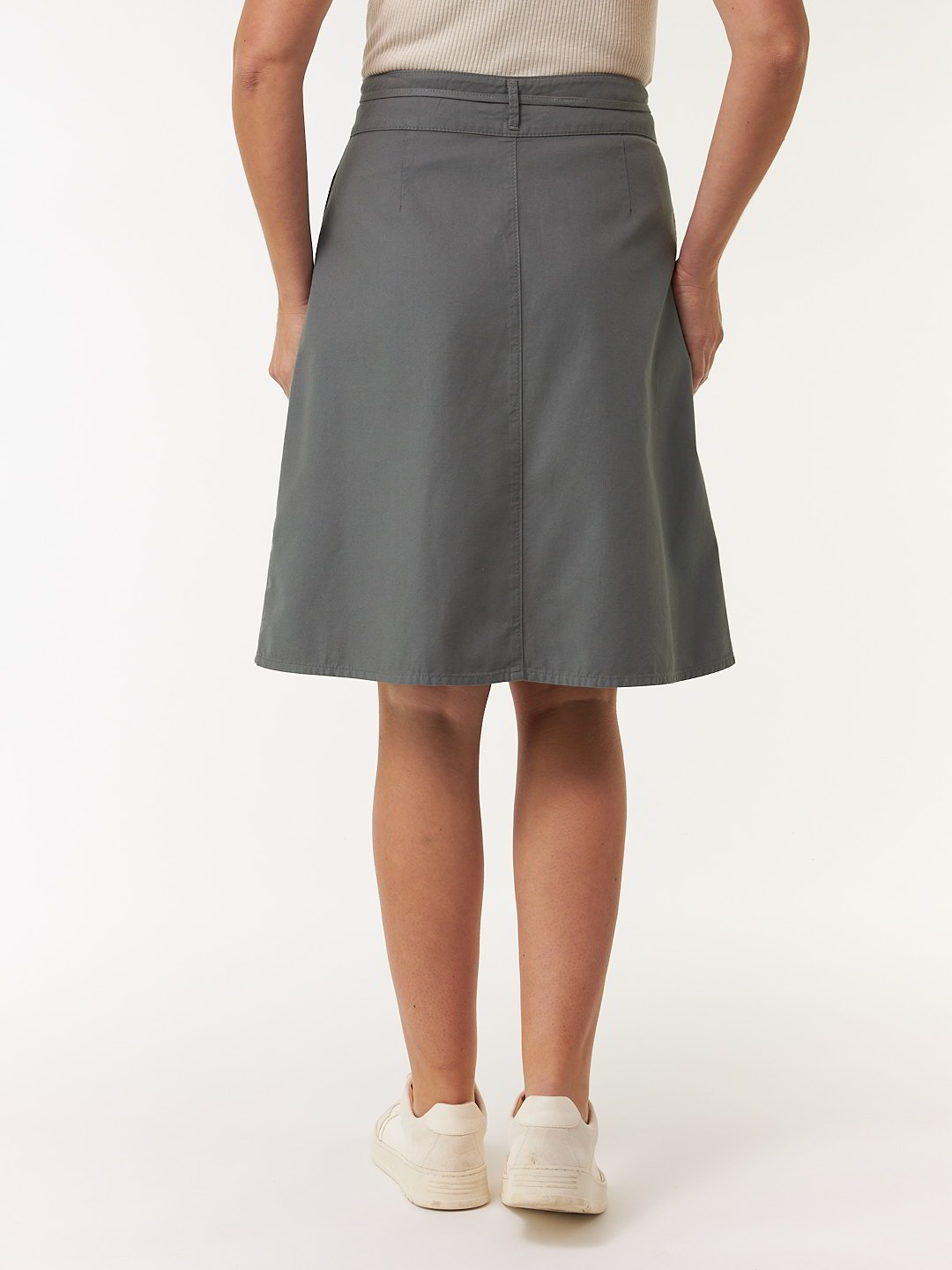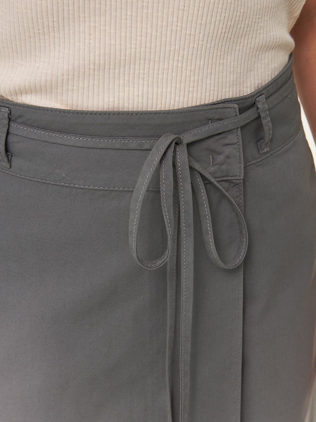 Sportiver Wickelrock im Utility-Stil aus robuster Baumwoll-Qualität. Das Modell zeigt sich in feiner A-Linie mit klaren, funktionalen Details: Zwei seitliche Eingriffstaschen, Gürtelschlaufen, Bund mit Haken-Verschluss und Gegenknopf sowie ein zusätzliches, sehr feines Bindeband sorgen für sicheren Sitz und flexible Weite.