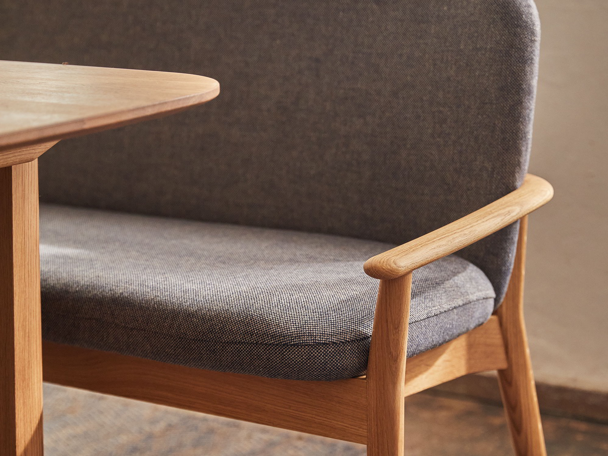 Vollholz aus nachhaltig bewirtschafteten Wäldern, handwerklich erstklassig verarbeitet; Massivholzrahmen mit fixverleimten, metallfreien Dübelverbindungen; von Hand geölte Holzoberfläche. Sitzflächenbespannung mit Hanfgurten, sandwichartiger Polsteraufbau mit Kokoslatex, Naturlatex und Schurwollfilz.-