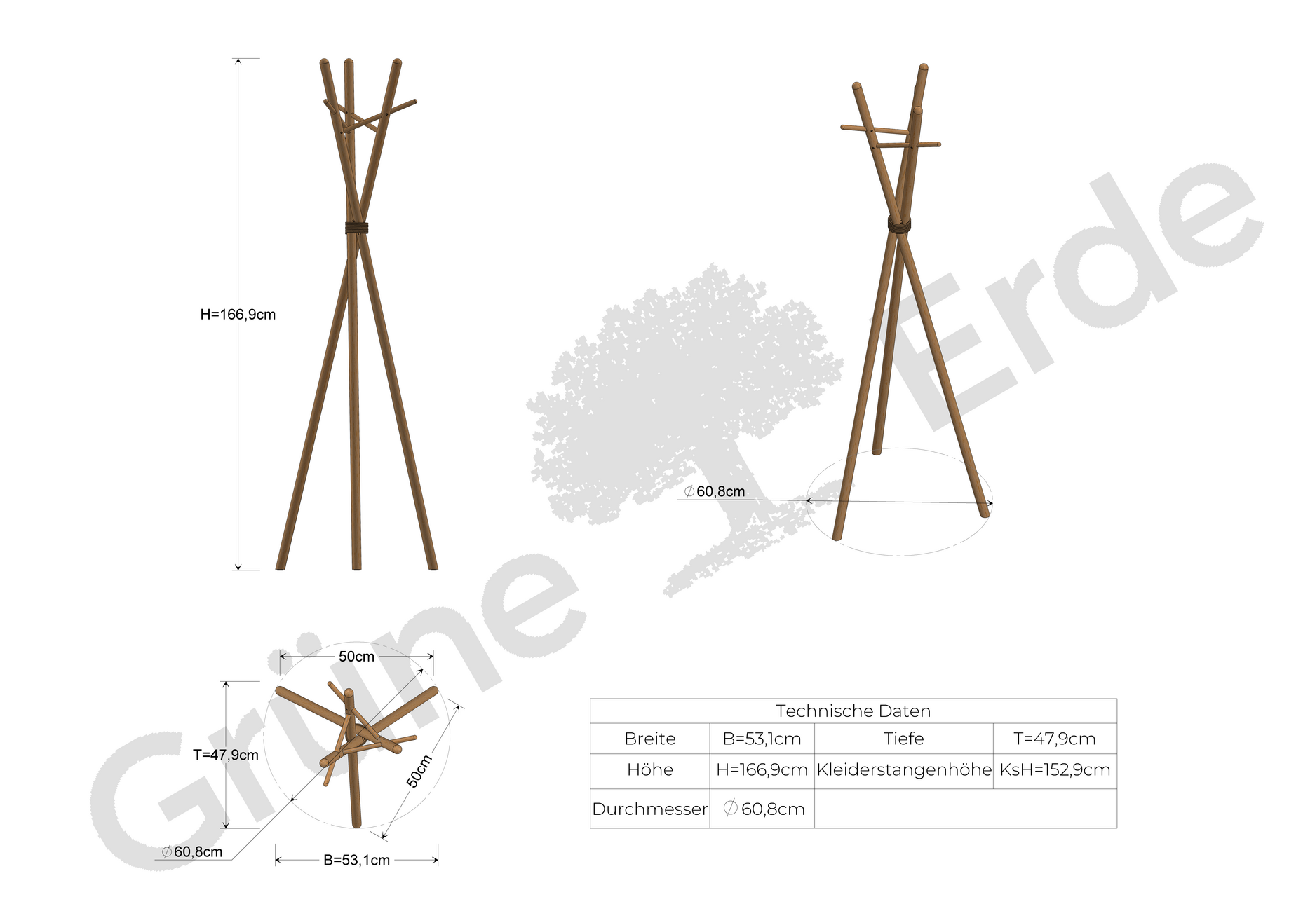 Optisch zart und leicht, dennoch stabilDer verblüffend einfach, optisch zart und leicht erscheinende, dabei sehr stabile Kleiderständer Kentai ist vielfältig einsetzbar. Er lässt sich ohne Qualitäts- und Funktionsverlust wiederholt zusammenbauen, zerlegen und platzsparend transportieren. All diese Eigenschaften machen ihn perfekt geeignet für modernes, mobiles, flexibles Wohnen.Die raffiniert ineinander verschränkten langen und kurzen Holme nehmen Jacken, Mäntel, Hüte, Schals, Handtaschen oder Regenschirme auf.Material & Verarbeitung3 lange Holme (L 172,4 cm, Ø 3 cm), 3 kurze Holme (L 29 cm, Ø 1,5 cm), Massivholz aus nachhaltiger Forstwirtschaft in Mitteleuropa, je nach Wahl Buche oder Eiche, metallfrei, mit natürlichem, lösemittelfreiem Holzpflegeöl auf pflanzlicher Basis eingelassen.Das reißfeste Hanfseil (L 160 cm, Ø 5 mm) wird auf Zug um die 3 gekreuzten langen Holme gewickelt und mit einem Holzkeil fixiert. Kentai Pur ist 167 cm hoch, steht sehr stabil und hat eine Standfläche von Ø 60,8 cm.Gut zu wissenDieser Kleiderständer mit dem programmatischen Namenszusatz "Pur" gehört zu unserer gleichnamigen Kollektion und spiegelt deren Grundidee wider: klar, schlicht, einfach, funktionell, auf das Wesentliche konzentriert, zu 100 % aus Naturmaterialien gefertigt, attraktiver Preis.Wir liefern Kentai zerlegt im Flatpack zur Selbstmontage. Das einfache Zusammenbauen ist ein kleines spielerisch-schöpferisches Erlebnis, das Freude bereitet.Schön zu wissenDer Name Kentai kommt aus dem Japanischen und bedeutet soviel wie Bescheidenheit, Zurückhaltung, was den Charakter des Kleiderständers gut beschreibt. -