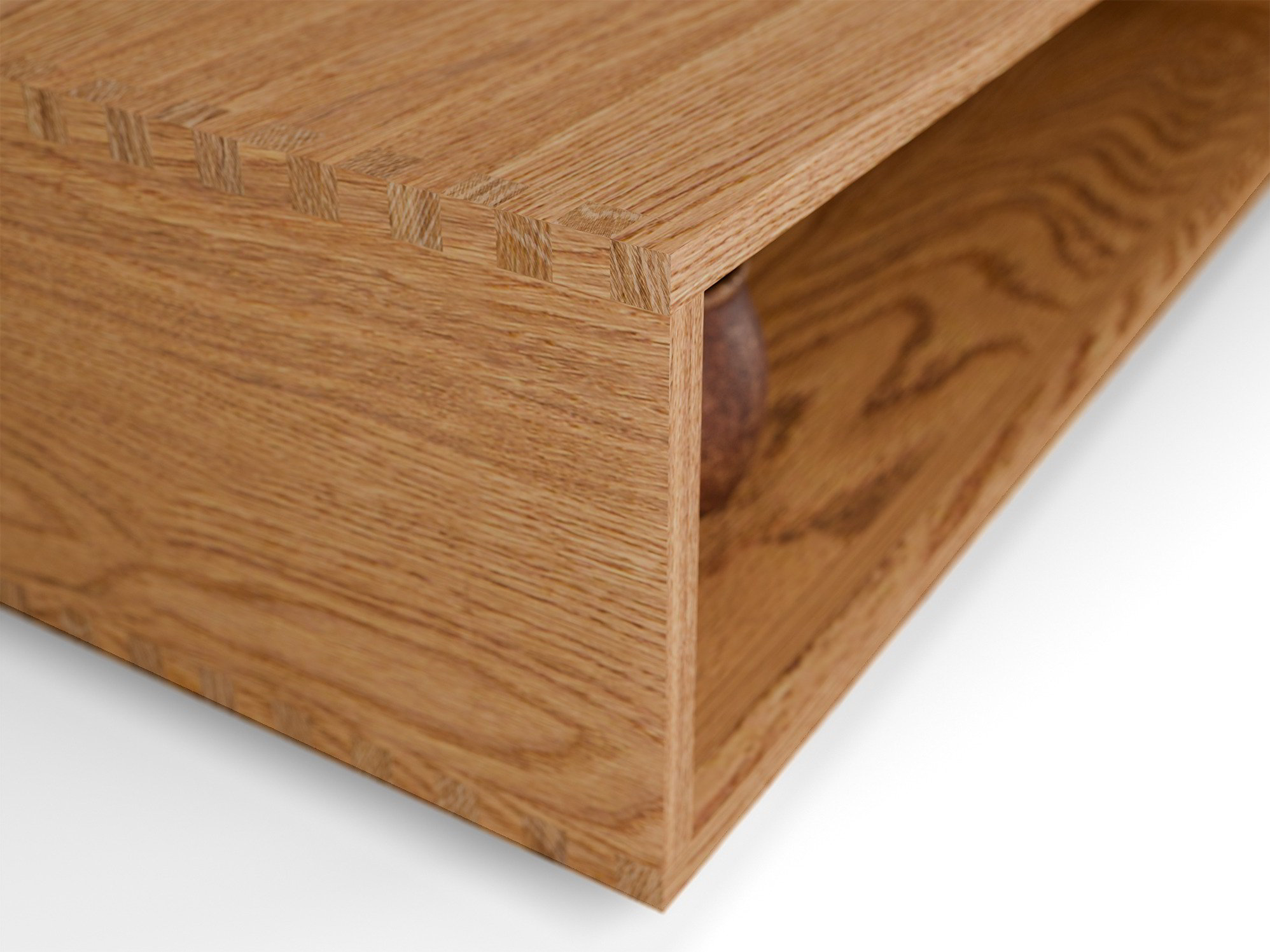 Jukai ist in Massivholz sehr stabil ausgeführt und mit optisch attraktiven, funktionell dauerhaften Fingerzinken als Eckverbindungen versehen. Aufgrund dieser Solidität kann der Tisch auch als informelle Sitzgelegenheit dienen.