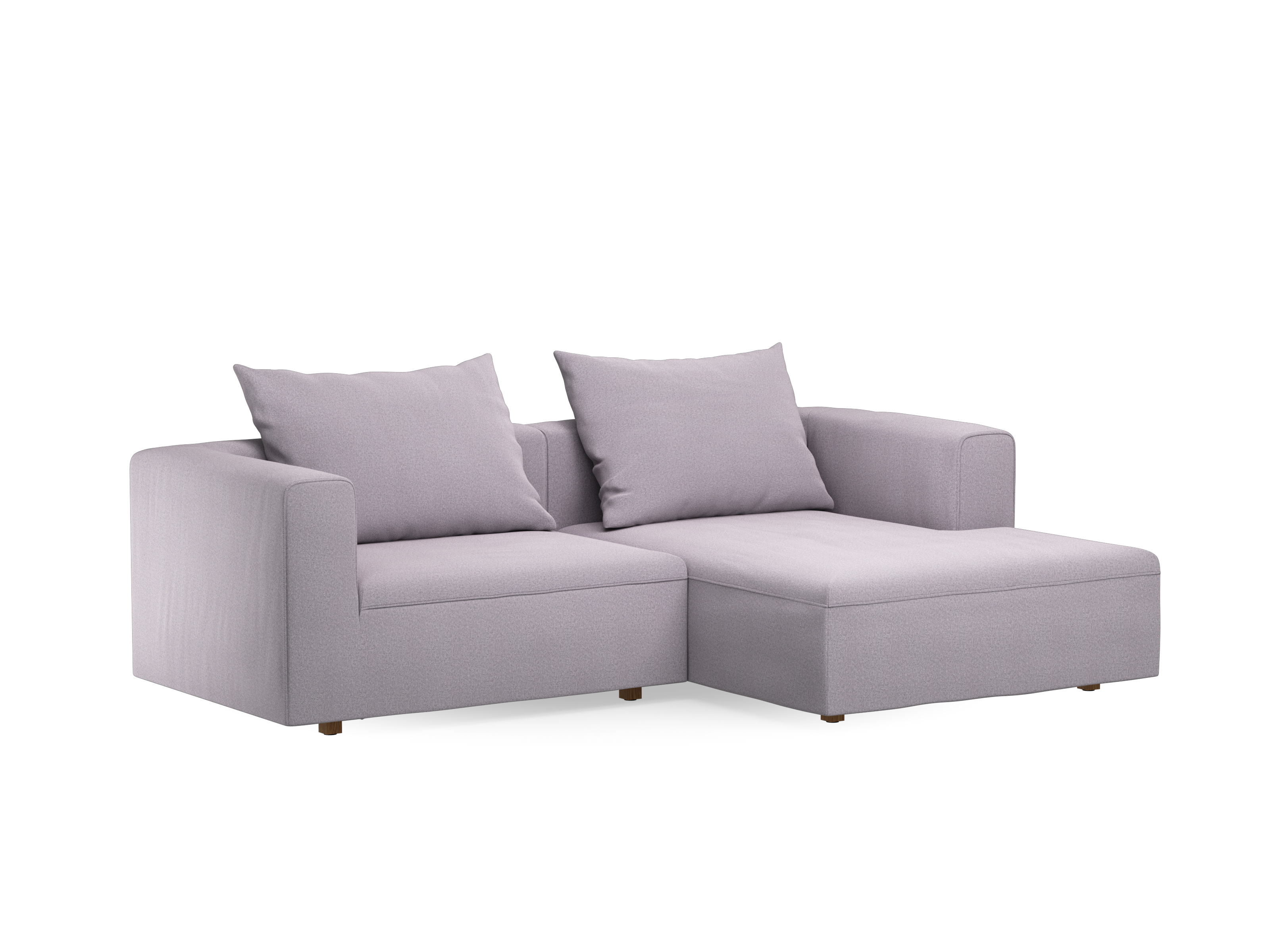 Das Lounge-Sofa mit den kompakten (Außen)Maßen 246 x 162 cm besteht aus einem Sitz- und einem links oder rechts fix ankoppelbaren Liegeteil. Kombiniert man das Lounge-Sofa nun bündig mit dem Hocker, entsteht eine geschlossene Polsterfläche von 140 x 200 cm, die zum bequemen Sitzen, Loungen und Schlafen einlädt. Die Füße des Hockers sind mit rutschfesten Naturkautschuk-Gleitern versehen, sodass er nicht fix mit dem Sofa verbunden werden muss – und daher einfach handhabbar und mobil ist.