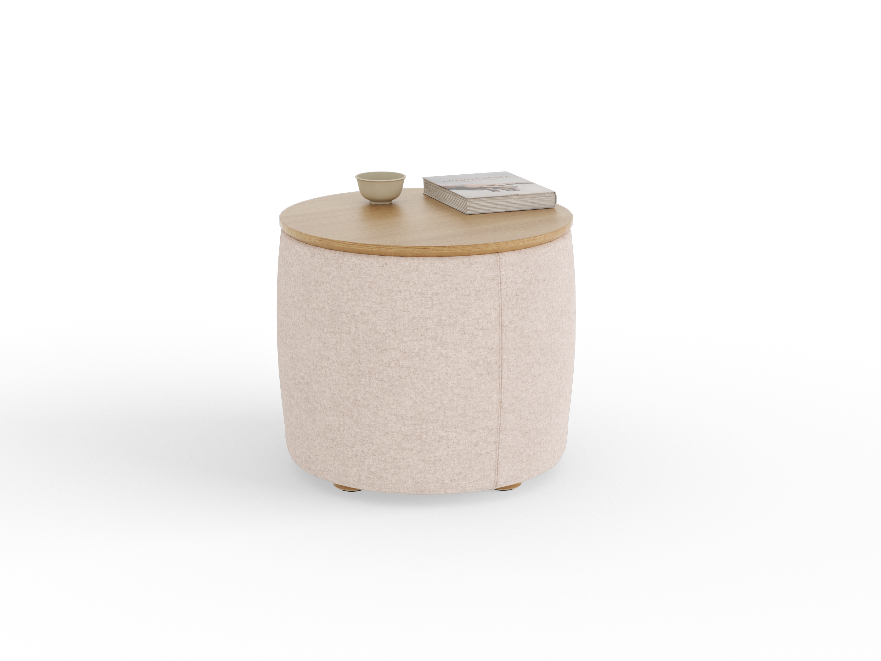 Sofatisch/Hocker Tambor mit Stauraum u. Holzdeckel, H 34,3 cm, Ø 39 cm, Bezug Wollstoff Stavang Sand (66), Eiche