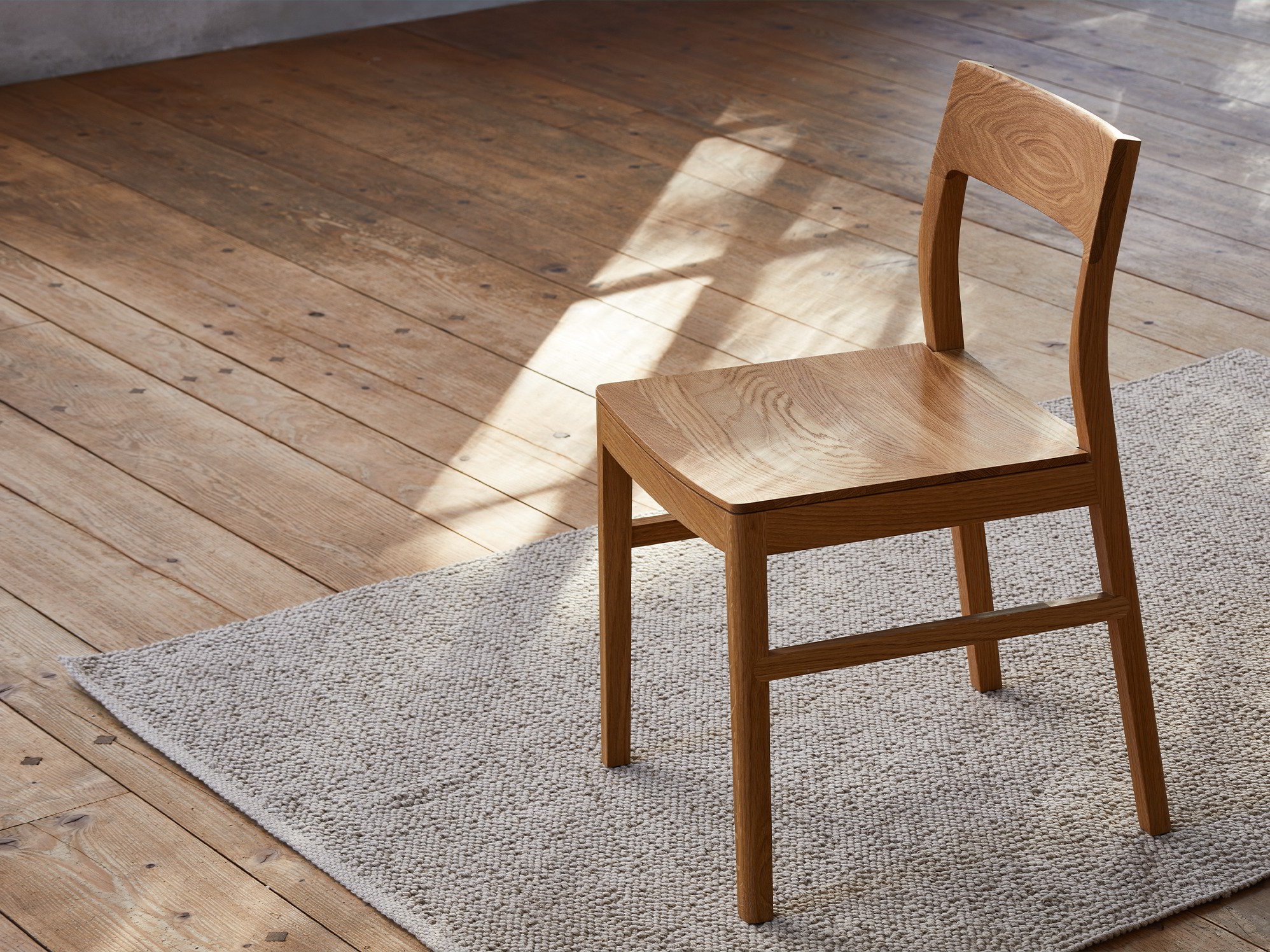 Holz oder Papierschnur?Der aufgrund seiner klaren, zeitlos eleganten Formen zu vielen verschiedenen Tischen passende, relativ leichte Massivholzstuhl Karim hat das Potenzial, zu einem Grüne Erde-Klassiker zu werden. Der bequeme Stuhl kann mit einer aus Massivholz gefertigten oder aus Papierschnur geflochtenen Sitzfläche gewählt werden.Die beiden nach hinten geneigten Holme und die rückengerecht geformte Lehne sind "überblattet", ebenso die Stuhlbeine und deren Verbindungssprossen: eine feinsinnige, metallfreie Holzfügetechnik.Sitzfläche aus MassivholzDie vom Rahmen durch eine elegante Schattenfuge optisch abgesetzte Sitzfläche ist aus ""brettverleimtem"" Massivholz, eine sanfte Mulde sorgt für hohen Sitzkomfort. Damit die große Holzfläche auch bei wechselnder Luftfeuchtigkeit stabil bleibt, ist sie mit dem Rahmen nur indirekt – über kleine Holzblöcke und eingeleimte Dübel – verbunden: eine klassische tischlerhandwerkliche Lösung.Sitzfläche aus PapierschnurFür diese Modellvariante von Karim verarbeiten wir ""Danish Cord"", eine in den 1940er-Jahren in Dänemark speziell für geflochtene Sitzflächen entwickelte, in sich gedrehte, extrem reißfeste Papierschnur. Etwa 120 m davon werden über den Sitzrahmen und an dessen Innenseiten montierte Holzdübel verflochten: etwa eineinhalb bis zwei Stunden sorgfältige, konzentrierte Handarbeit!Das fein strukturierte Geflecht ist nicht nur bequem, leicht und luftdurchlässig, sondern auch hoch belastbar, äußerst langlebig – und bei Bedarf erneuerbar.MaterialMassivholz aus nachhaltiger, mitteleuropäischer Forstwirtschaft, tischlermäßig sorgfältig verarbeitet, metallfrei, von Hand mit natürlichem, lösemittelfreiem Pflegeöl eingelassen; Papierschnur aus FSC-zertifizierten Hölzern.Gut zu wissen: Zu Karim kann eine Sitzauflage aus Filz inkl. Gitterstoppmatte in den Farben Kiesel und Haselnuss gewählt werden. -