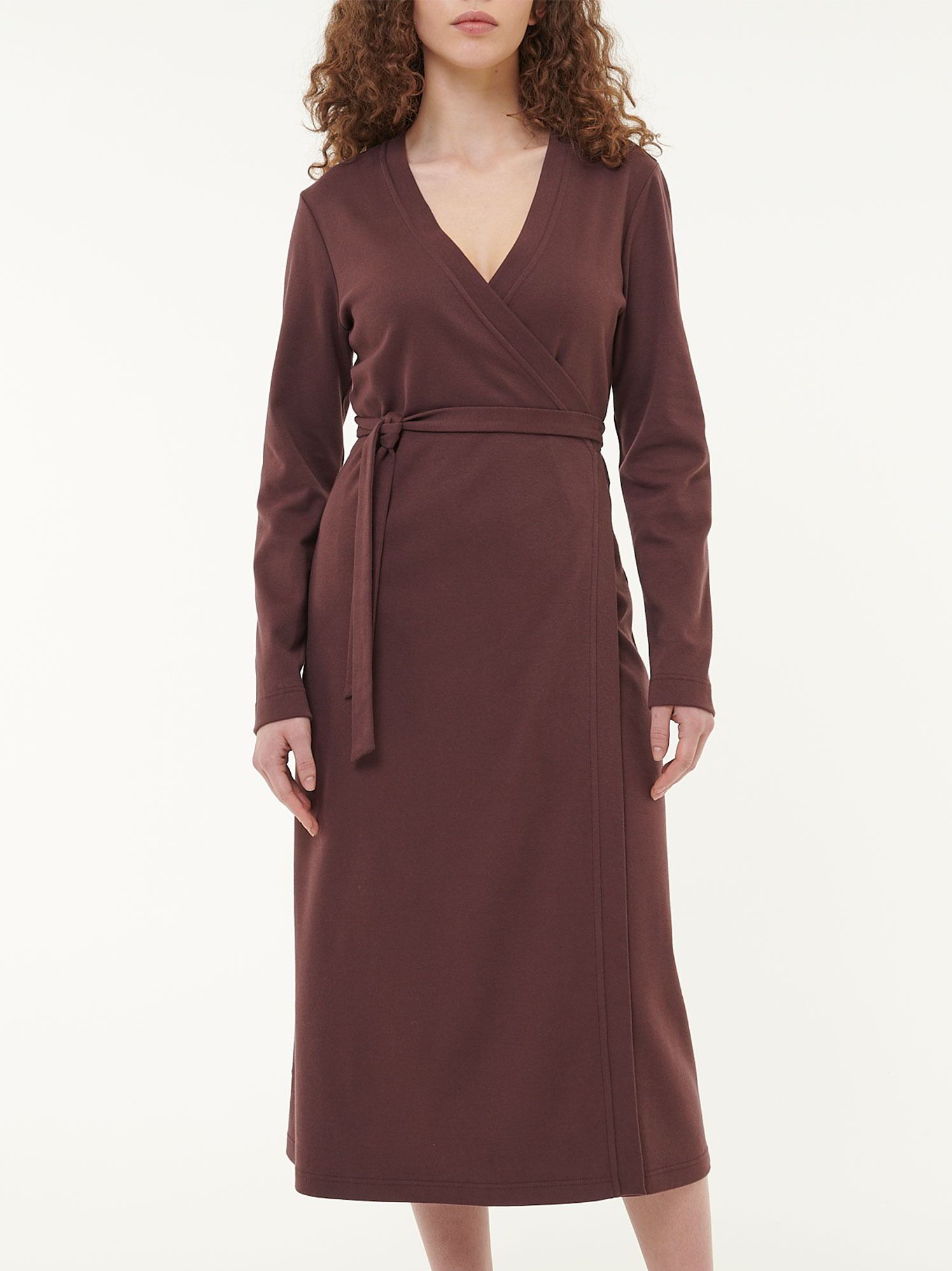 Schlicht im Look. Sanft zur Haut.Wickelkleid aus weicher Sweat-Qualität: Gefertigt aus feinem Interlock-Jersey für ein angenehmes Tragegefühl mit angenehm-fester Textur. Der figurumspielende Fit – abgerundet mit langen Ärmeln und der Wickelverschluss mit Blendenverarbeitung und Bindebändern V-Ausschnitt – sorgt für eine feminine Silhouette und einen entspannten Look – ein Everyday Piece zum Wohlfühlen. Mit Bindegürtel.Schnitt: figurumspielend/maxi. Innenbeinlänge in Größe 36 ca. 120 cm. Unsere Models sind zwischen 175 cm und 177 cm groß und tragen Kleidergröße 36.Ökologisch & fair produziertDieses Kleidungsstück entsteht aus Baumwolle kbA und Wolle kbT. Es wird nach strengen Richtlinien – wie dem Global Organic Textile Standard – und nach größter ökologischer Sorgfalt bei unserem Partnerbetrieb gefertigt.Material: 100 % Baumwolle.Materialherkunft: Baumwolle kbA aus der Türkei. Gewirkt in Litauen. Gefertigt in Litauen nach dem GOTS. -