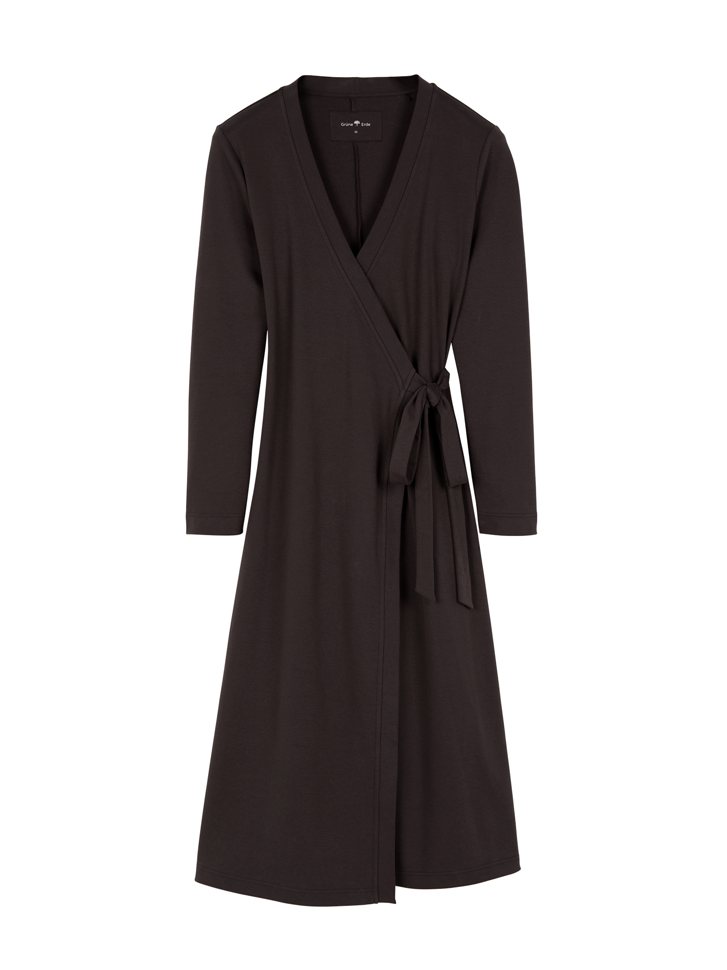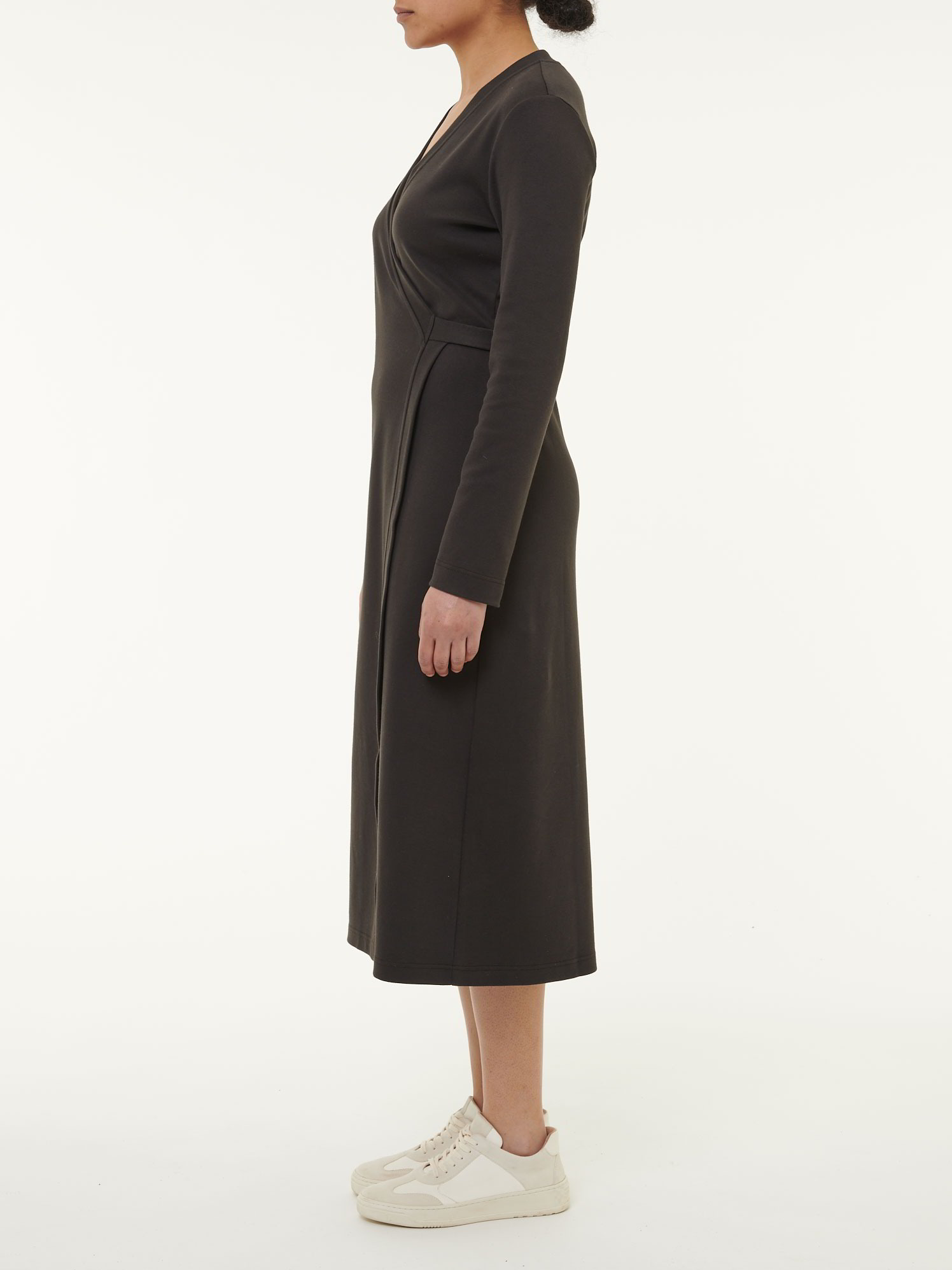 Schlicht im Look. Sanft zur Haut.Wickelkleid aus weicher Sweat-Qualität: Gefertigt aus feinem Interlock-Jersey für ein angenehmes Tragegefühl mit angenehm-fester Textur. Der figurumspielende Fit – abgerundet mit langen Ärmeln und der Wickelverschluss mit Blendenverarbeitung und Bindebändern V-Ausschnitt – sorgt für eine feminine Silhouette und einen entspannten Look – ein Everyday Piece zum Wohlfühlen. Mit Bindegürtel.Schnitt: figurumspielend/maxi. Innenbeinlänge in Größe 36 ca. 120 cm. Unsere Models sind zwischen 175 cm und 177 cm groß und tragen Kleidergröße 36.Ökologisch & fair produziertDieses Kleidungsstück entsteht aus Baumwolle kbA und Wolle kbT. Es wird nach strengen Richtlinien – wie dem Global Organic Textile Standard – und nach größter ökologischer Sorgfalt bei unserem Partnerbetrieb gefertigt.Material: 100 % Baumwolle.Materialherkunft: Baumwolle kbA aus der Türkei. Gewirkt in Litauen. Gefertigt in Litauen nach dem GOTS. -