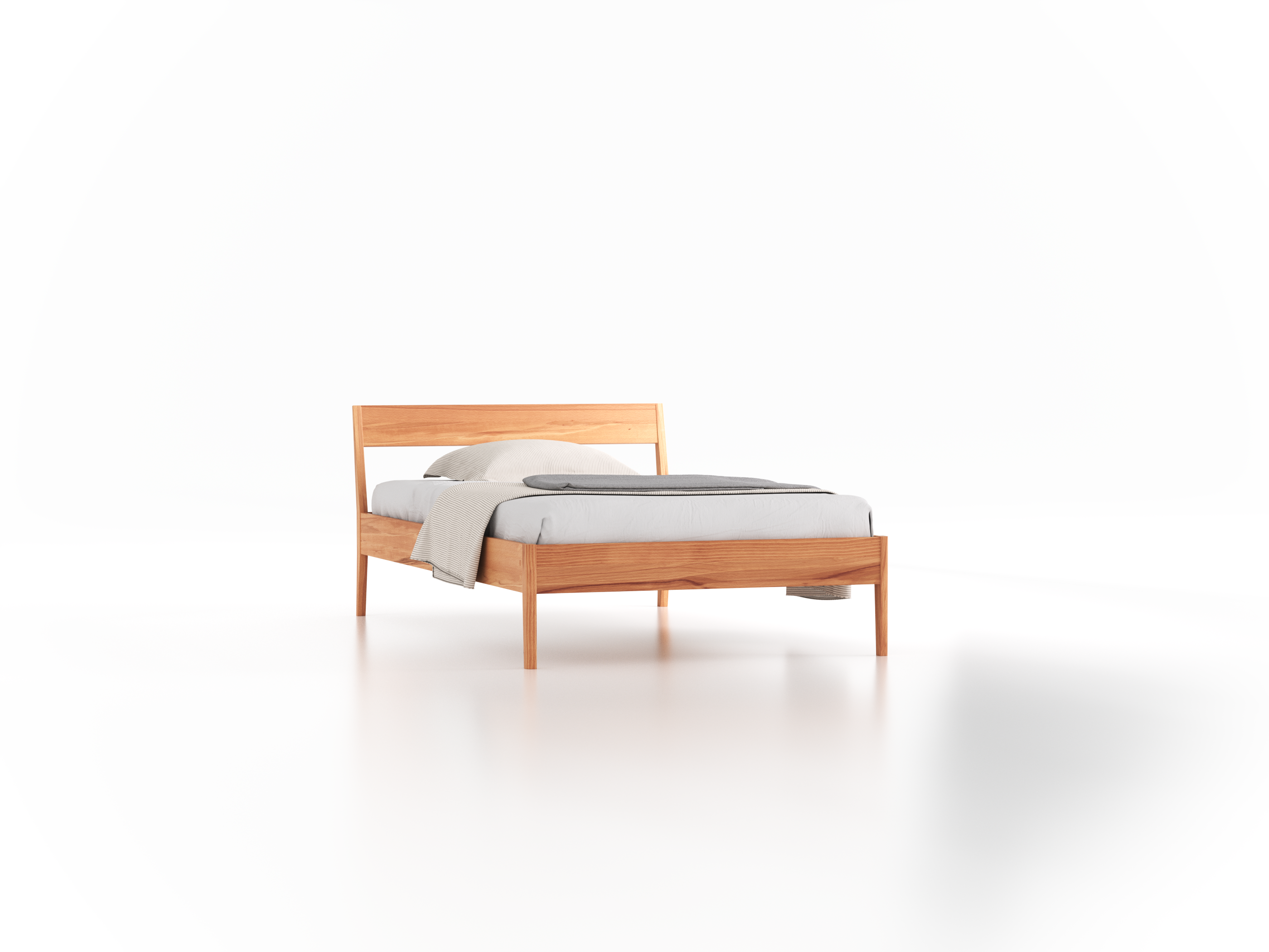 Für "Anlehnungsbedürftige"Almeno ist das beliebteste Bett von Grüne Erde. Auch, weil es unser vielfältigstes ist. Sie können es in mehreren Holzarten und Varianten wählen: ganz "basic" ohne Betthaupt, als Polsterbett, mit Sprossenbetthaupt oder – wie hier – mit einem Steg-Betthaupt.Das Bett erfüllt alle hohen Anforderungen an ein Grüne Erde-Möbel: 100 % nachwachsende Naturmaterialien, hohe Qualität, sorgfältiges Handwerk, Langlebigkeit.Almeno kann jederzeit mit praktischen, auf den Bettrahmen steckbare Ablageboxen ergänzt werden.Dynamischer Schwung & hohe StabilitätDas stabile Betthaupt neigt sich sanft etwas nach hinten und bildet gemeinsam mit dem Bettfuß einen dynamischen Schwung. Es lädt zum bequemen, knarzfreien Anlehnen ein, etwa beim Lesen oder beim abendlichen Gedankenaustausch mit dem Partner bzw. der Partnerin.Material & FertigungDas hochwertige, dauerhafte Massivholz für Almeno stammt aus mitteleuropäischen, nachhaltig bewirtschafteten Wäldern. Die Teile des Bettes werden von passgenauen, bei Bedarf wieder lösbaren Holzsteckverbindungen fest zusammengehalten. Dank dieser metallfreien Lasche-und-Dübel-Verbindungen lässt sich Almeno ohne Qualitäts- und Funktionsverlust wiederholt zerlegen und wieder zusammenbauen – ganz im Sinne der langen Nutzungsdauer des Bettes.Die Holzoberfläche ist von Hand mit duftendem, natürlichem Pflegeöl (lösemittelfrei) eingelassen. Zirbe bleibt vollständig unbehandelt, damit der charakteristische Duft dieser Holzart gut zur Geltung kommt.Hinweis: Preis inklusive Aufstellservice, ohne Lattenrost, Matratze und Zubehör. -