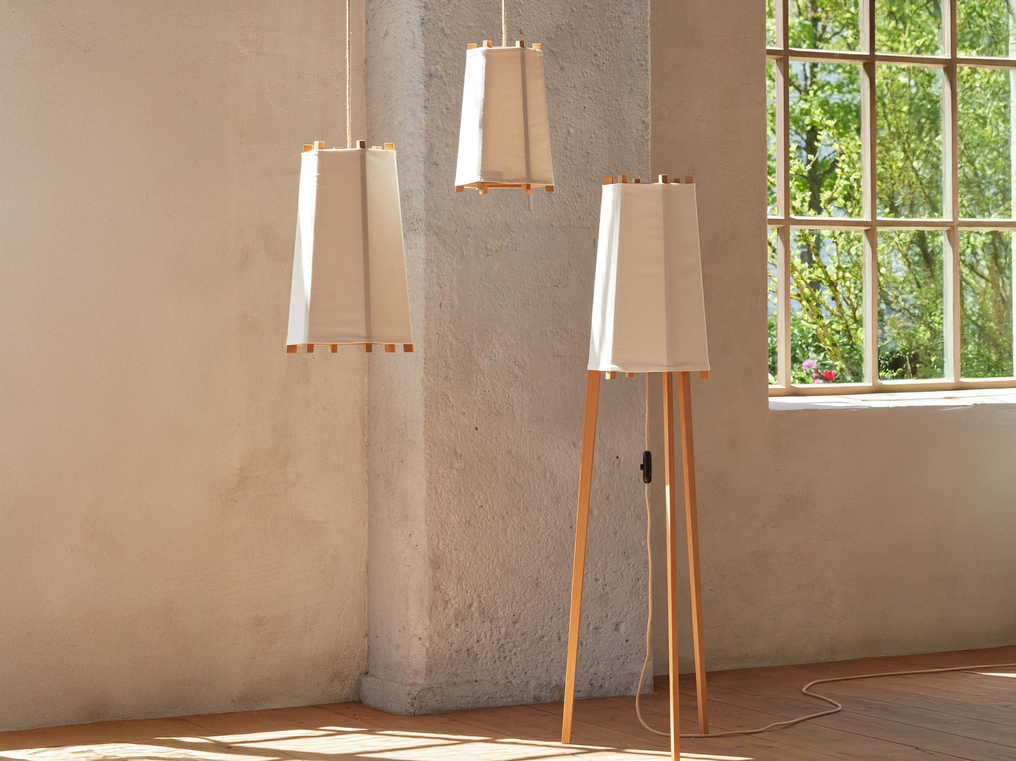 Das hölzerne Gestell des Leuchtenschirms besteht aus einem 6-eckigen Ring und einer 6-eckigen Platte, die durch 6 Spanten miteinander verbunden sind. Der über das Gestell gestülpte, straff sitzende Leuchtenschirm aus Baumwollgewebe sorgt für warmes, angenehmes Licht.