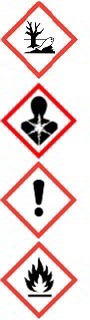 Flüssigkeit und Dampf leicht entzündbar. Kann bei Verschlucken und Eindringen in die Atemwege tödlich sein. Giftig für Wasserorganismen, mit langfristiger Wirkung. Verursacht Hautreizungen. Verursacht schwere Augenreizung. Kann allergische Hautreaktionen verursachen. Von Hitze, heißen Oberflächen, Funken, offenen Flammen und anderen Zündquellen fernhalten. Nicht rauchen. Schutzhandschuhe / Augenschutz tragen.