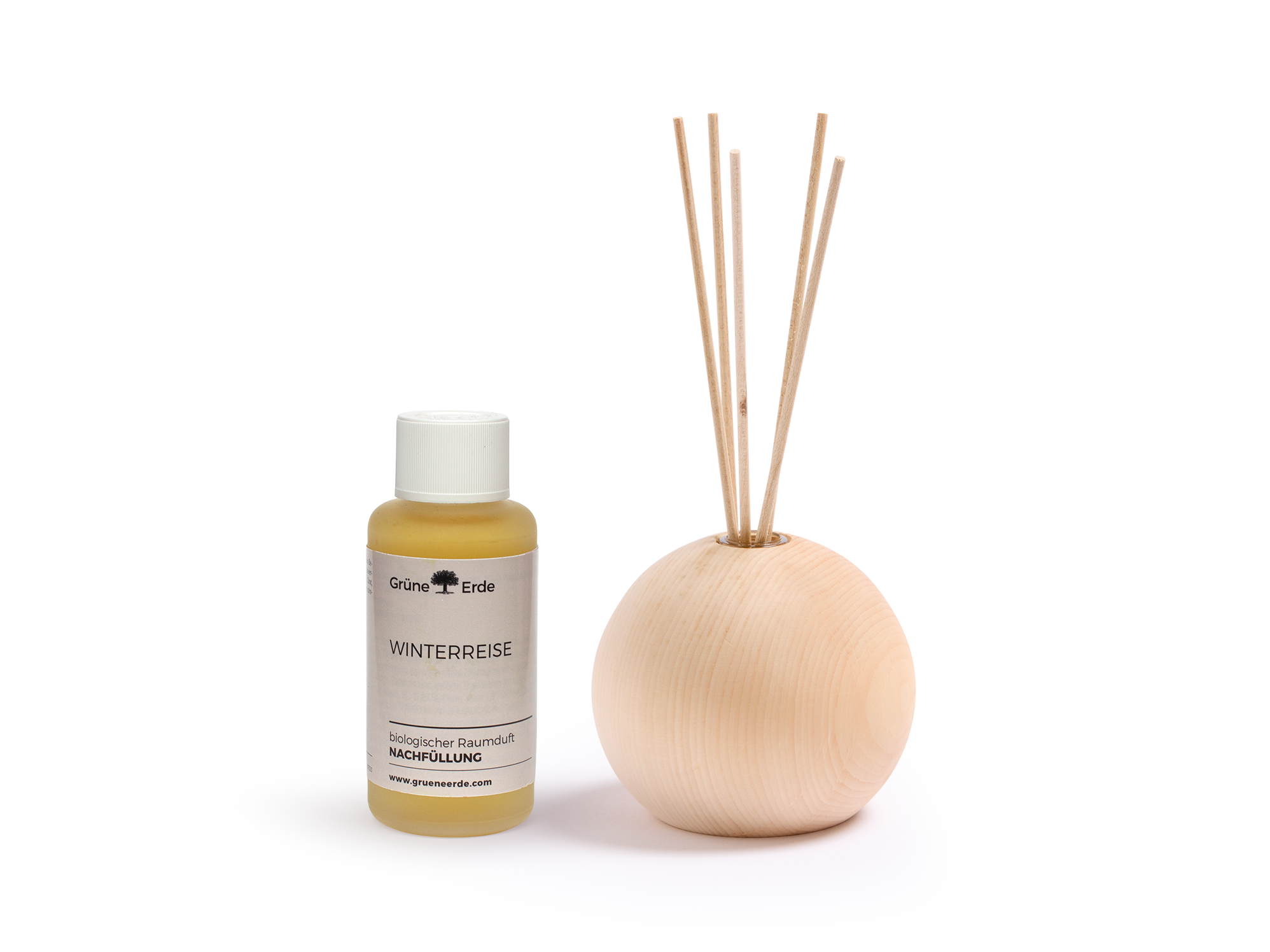 Set enthält: runder Diffuser aus Zirbenholz, 10 Ahornstäbchen und 100 ml biologischer Raumduft WINTERREISE.