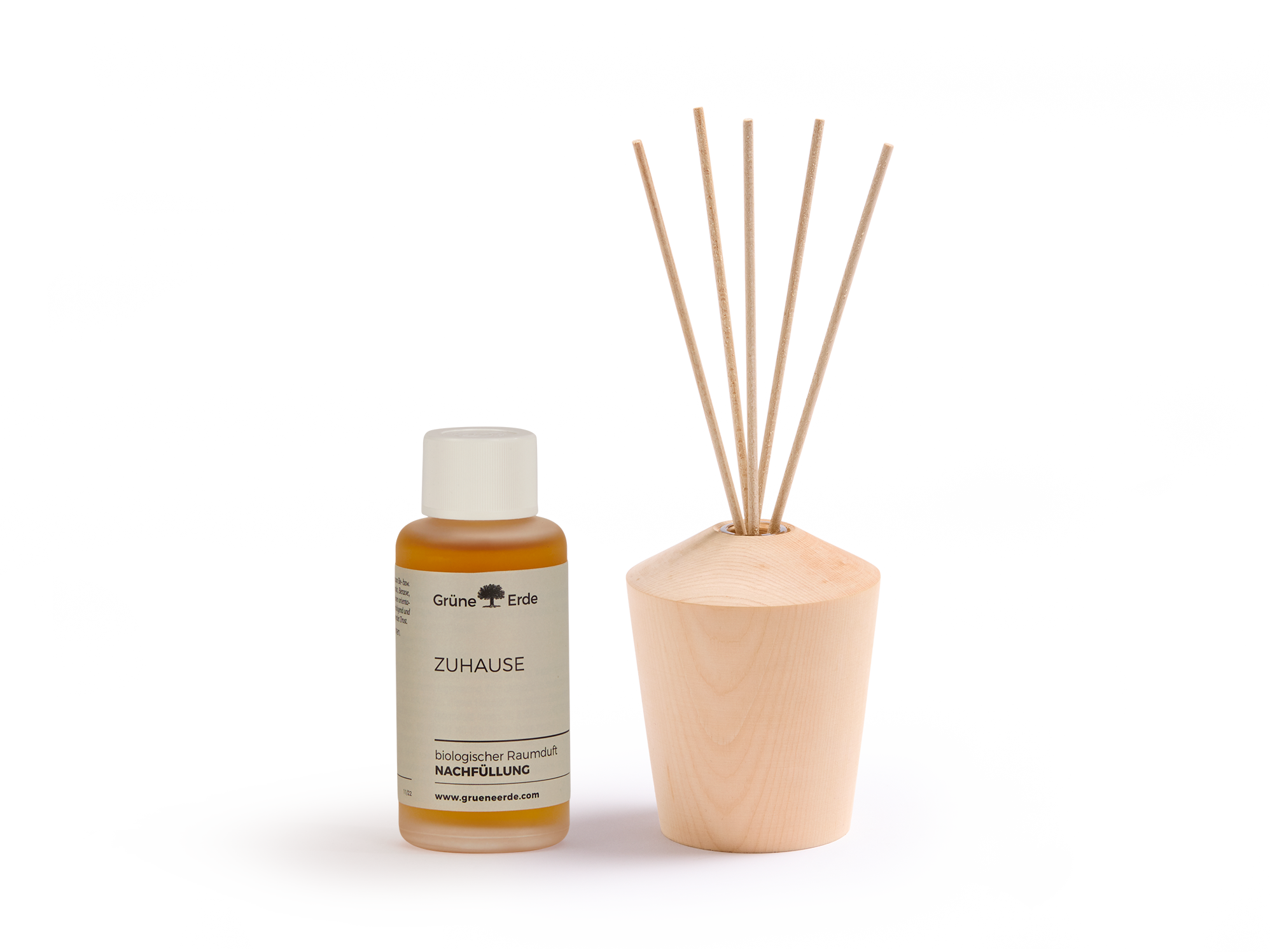 Set enthält: konischer Diffuser aus Zirbenholz, 10 Ahornstäbchen und 100 ml biologischer Raumduft ZUHAUSE.