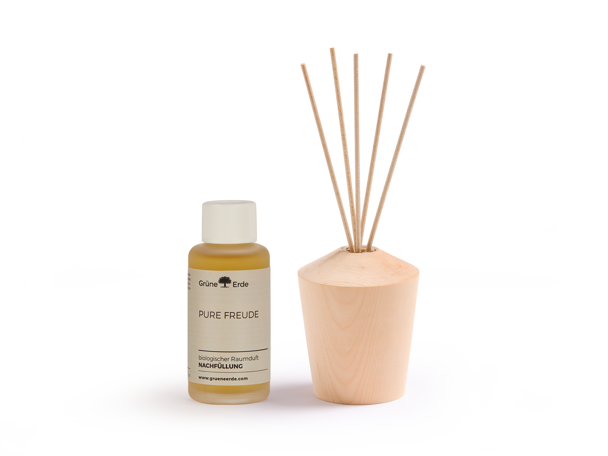 Set enthält: konischer Diffuser aus Zirbenholz, 10 Ahornstäbchen und 100 ml biologischer Raumduft PURE FREUDE.