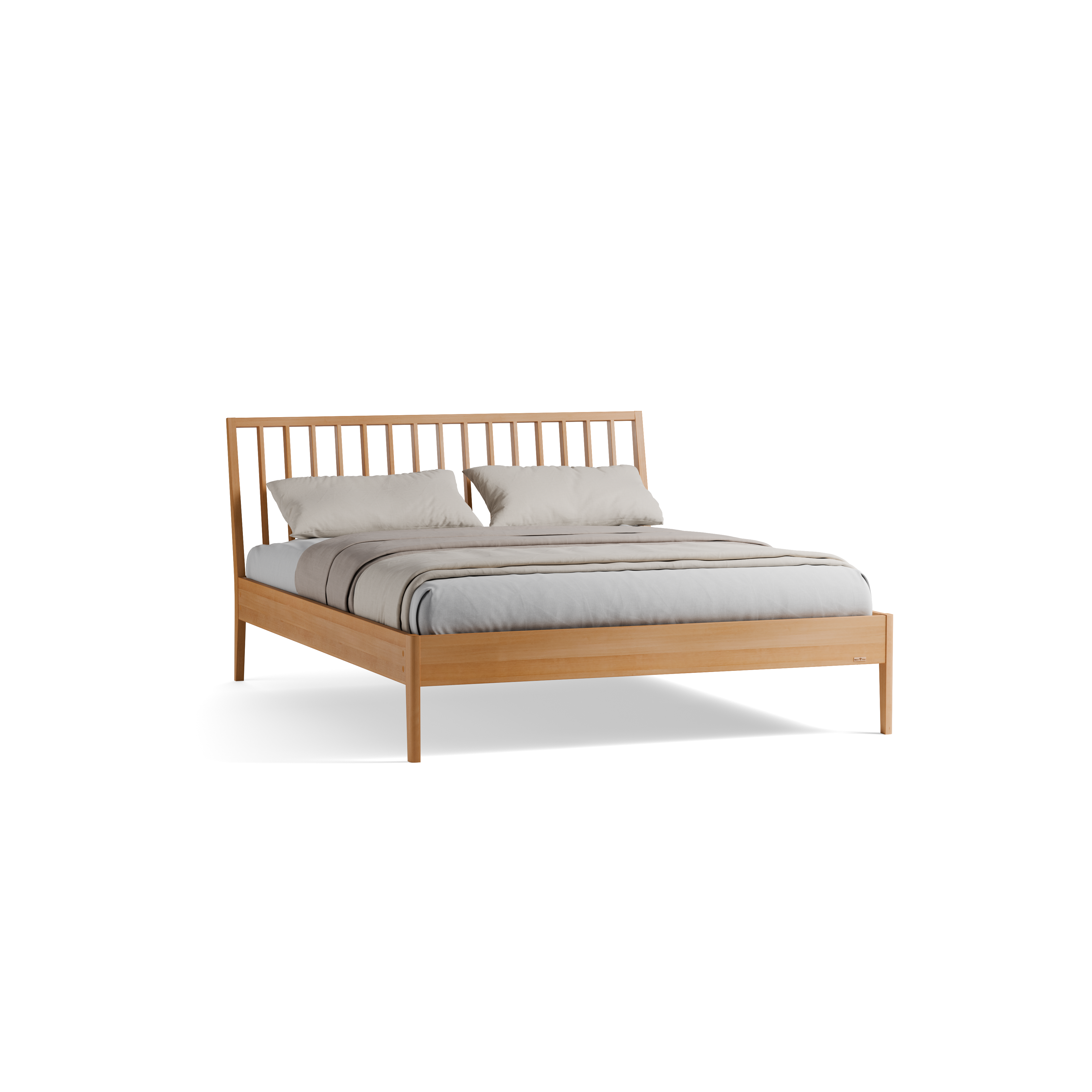 Almeno ist das beliebteste Bett von Grüne Erde. Auch, weil es unser vielfältigstes ist. Sie können es in mehreren Holzarten und Modellvarianten wählen, wie hier mit einem feingliedrigen vertikalen Sprossenbetthaupt. Es verleiht dem Bett emporstrebende Anmut und ätherische Leichtigkeit.