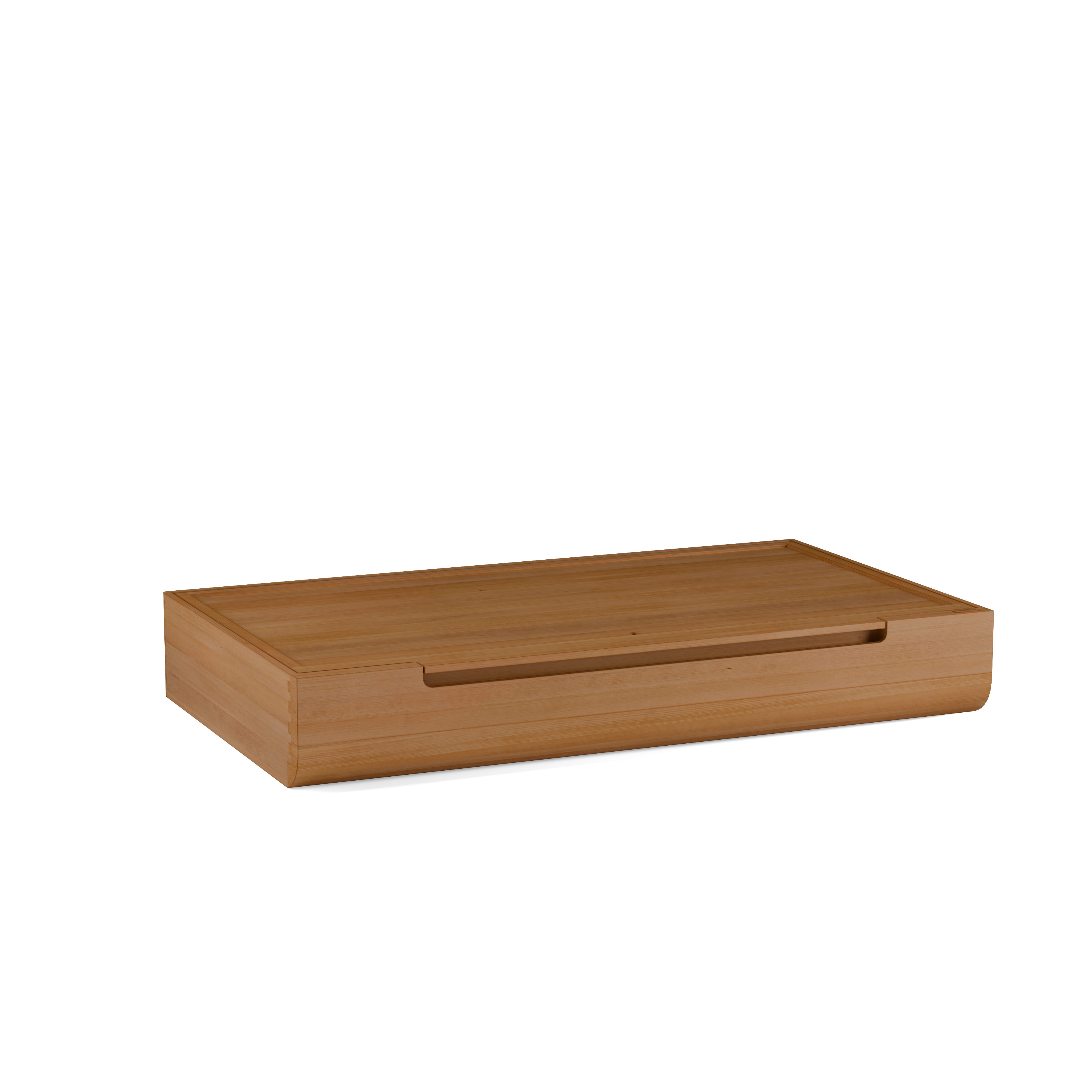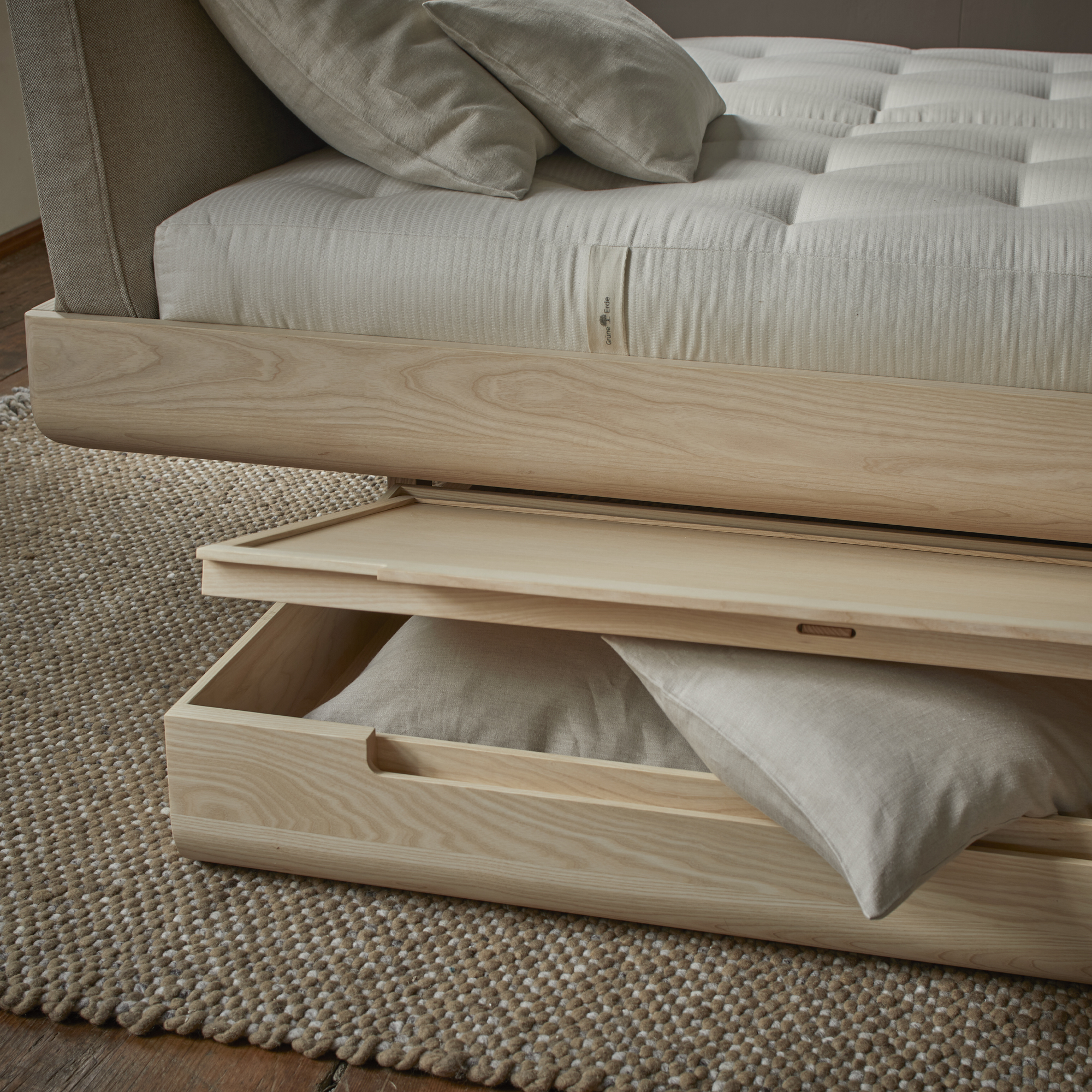 Die beiden nach innen versetzten, kaum sichtbaren, kufenförmigen Fußgestelle und das abgerundete Profil des Bettrahmens verleihen Almara eine abgehobene, schwebende Anmutung. Der Bettkasten Almara passt genau zu dieser Anmutung und ergänzt das Bett perfekt – er passt genau in das Fußgestell. Er macht aber auch unter anderen Grüne Erde-Betten eine gute Figur, bietet viel Stauraum und schützt den Inhalt vor Staub.