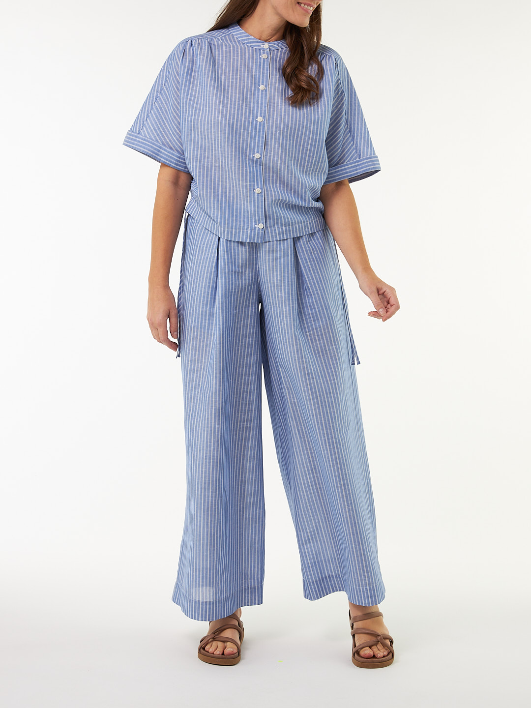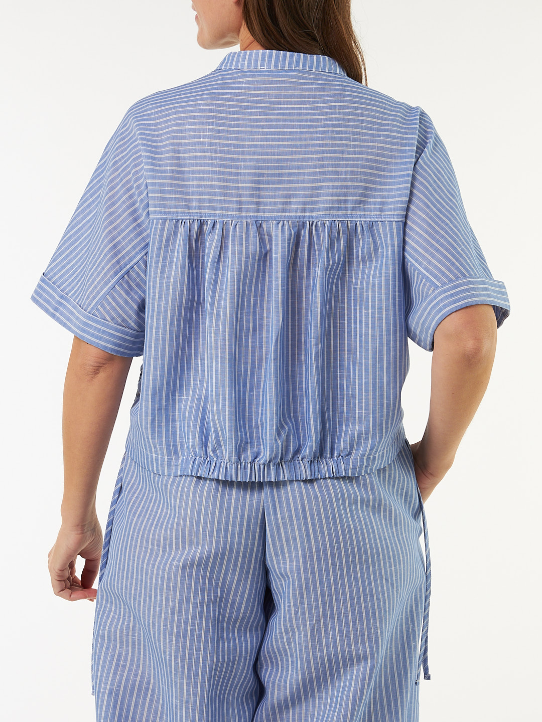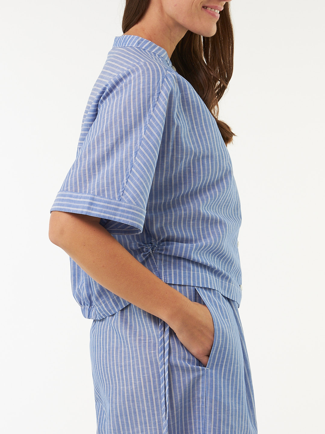 Kimono-Bluse aus besonders weicher Baumwolle und edlem Leinen – leicht und angenehm auf der Haut. Die legere Kimonoform und die kurze Schnittführung sorgen für eine entspannte Silhouette, veredelt durch modische Raffungen an der Seitennaht am Saum. Eine Schulterpasse mit Raffung auf der Rückseite, der eingearbeitete Gummizug am Saum sowie der elegante Umschlag an den Ärmelabschlüssen verleihen dem Modell eine stilvolle Note. Schmale Kragenblende und durchgehende Knopfleiste in der vorderen Mitte.